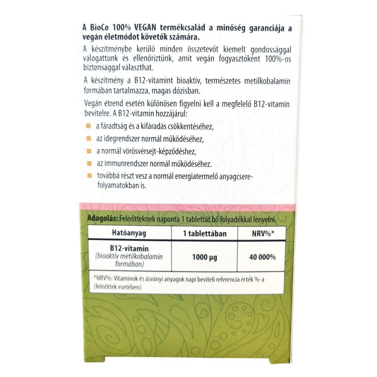 A BioCo 100% VEGAN termékcsalád magas minőséget képvisel a vegán életmódot követők számára. Minden összetevőt gondosan válogattak és ellenőriztek, hogy a fogyasztók biztonsággal választhassák a terméket. A B12-vitamin bioaktív, természetes metilkobalamin formában kerül a készítménybe, magas dózisban. Fontos, hogy vegán étrend esetén különösen figyeljenek a megfelelő B12-vitamin bevitelre, amely hozzájárulhat a fáradtság csökkentéséhez, az idegrendszer és immunrendszer normál működéséhez, a normál vörösvérsejt-képződéshez, valamint az energiatermelő anyagcsere-folyamatokhoz. A termék Magyar fejlesztésű és gyártású, azonban a hatóanyag nem Magyarországról származik.