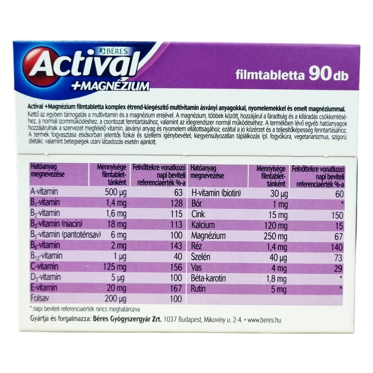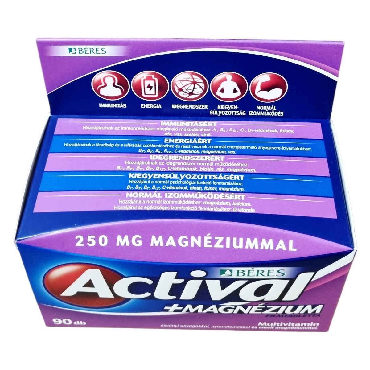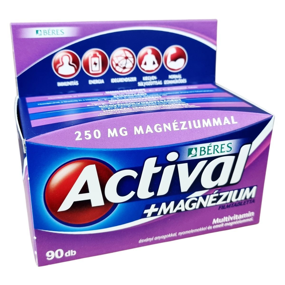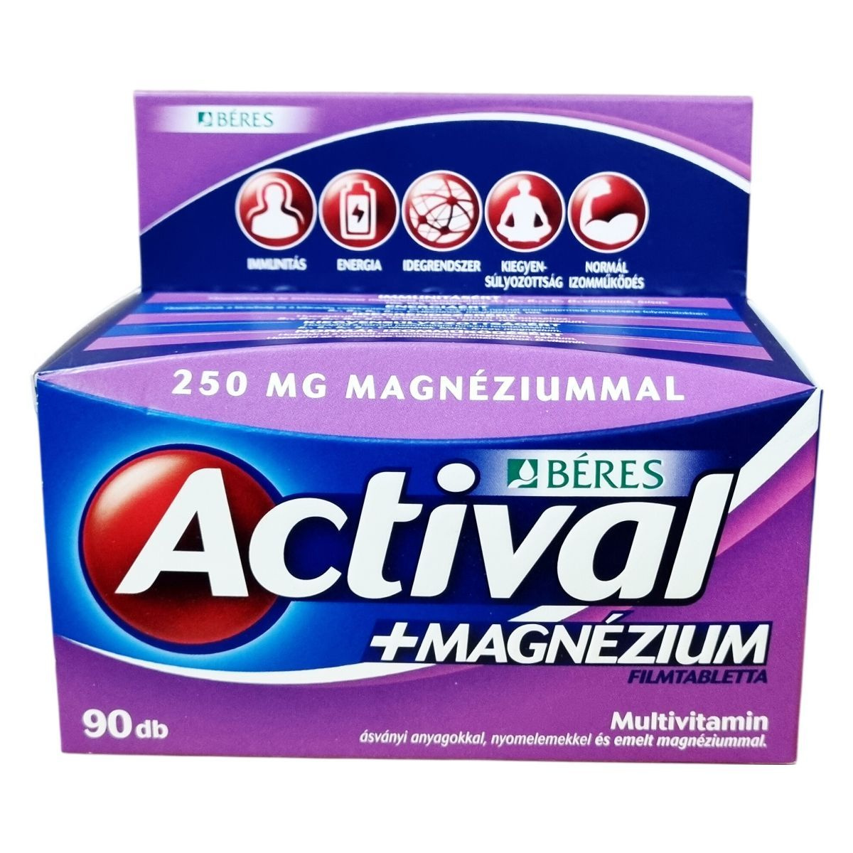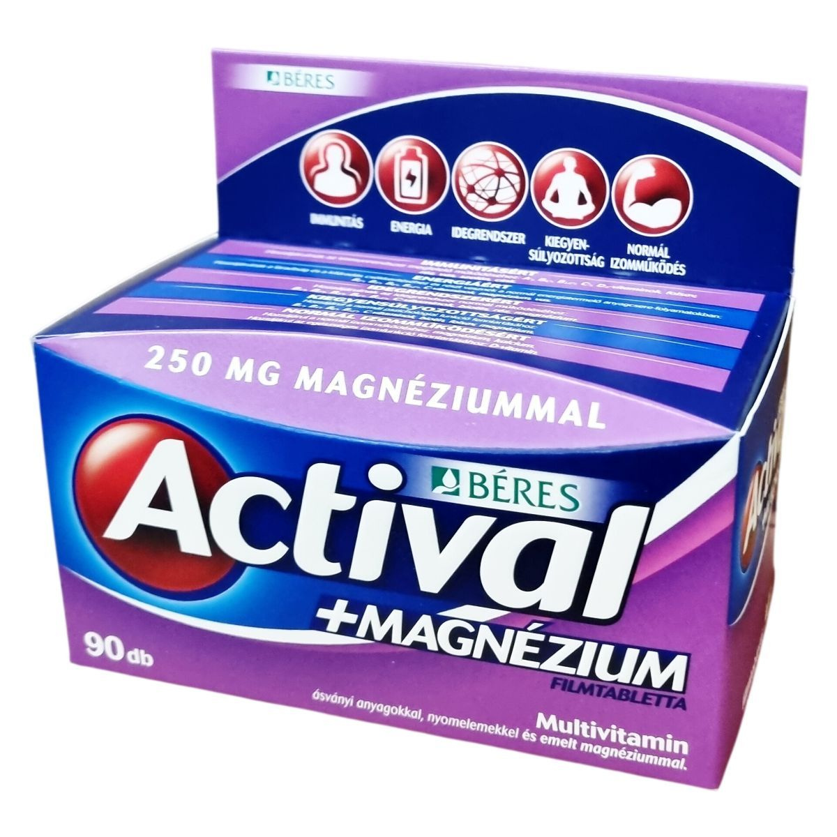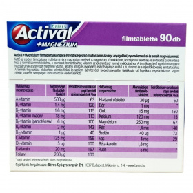 Az Actival +Magnézium filmtabletta komplex étrend-kiegészítő multivitamin készítmény ásványi anyagokkal, nyomelemekkel és emelt magnéziumtartalommal. Kettő az egyben támogatás a multivitamin és a magnézium erejével, amely segítheti a fáradtság és kifáradás csökkentését, a normál izomműködés fenntartását, a csontozat egészségét, valamint az idegrendszer normál működését. A benne található hatóanyagok hozzájárulhatnak a szervezet megfelelő vitamin-, ásványi anyag- és nyomelemellátottságához, így a jó közérzet és teljesítőképesség fenntartásához. Fogyasztása elsősorban jelentős fizikai és szellemi terhelés, kiegyensúlyozatlan táplálkozás, valamint betegségek utáni lábadozás esetén ajánlott. Az összetevők között megtalálhatók többek között a különböző vitaminok, ásványi anyagok, aminosavak, antioxidánsok és emulgeálószerek, amelyeket gondosan válogattak össze a hatékonyság és biztonság érdekében.