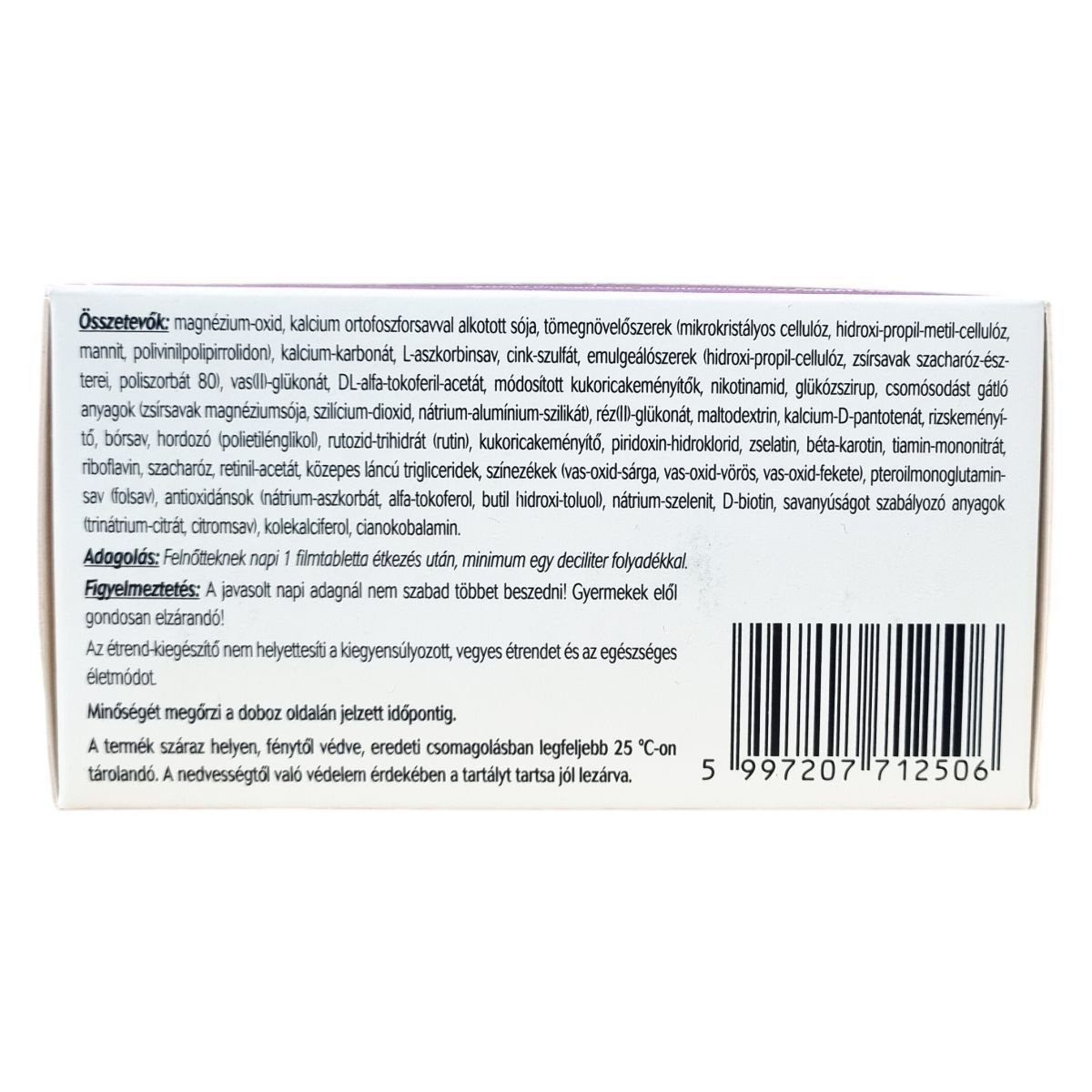 magnézium-oxid, kalcium ortofoszforsavval alkotott sója, mikrokristályos cellulóz, hidroxi-propil-metil-cellulóz, mannit, polivinilpolipirrolidon, kalcium-karbonát, L-aszkorbinsav, cink-szulfát, hidroxi-propil-cellulóz, zsírsavak szacharóz-észterei, poliszorbát 80, vas(II)-glükonát, DL-alfa-tokoferil-acetát, módosított kukoricakeményítők, nikotinamid, glükózszirup, zsírsavak magnéziumsója, szilícium-dioxid, nátrium-alumínium-szilikát, réz(II)-glükonát, maltodextrin, kalcium-D-pantotenát, rizskeményítő, bórsav, polietilénglikol, rutozid-trihidrát, kukoricakeményítő, piridoxin-hidroklorid, zselatin, béta-karotin, tiamin-mononitrát, riboflavin, szacharóz, retinil-acetát, közepes láncú trigliceridek, vas-oxid-sárga, vas-oxid-vörös, vas-oxid-fekete, pteroilmonoglutaminsav, nátrium-aszkorbát, alfa-tokoferol, butil hidroxi-toluol, nátrium-szelenit, D-biotin, trinátrium-citrát, citromsav, kolekalciferol, cianokobalamin