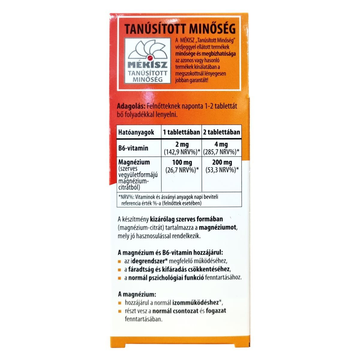 Magnézium (szerves vegyületformájú magnézium-citrátból) 200 mg (53,3 NRV%) 2 tablettában.