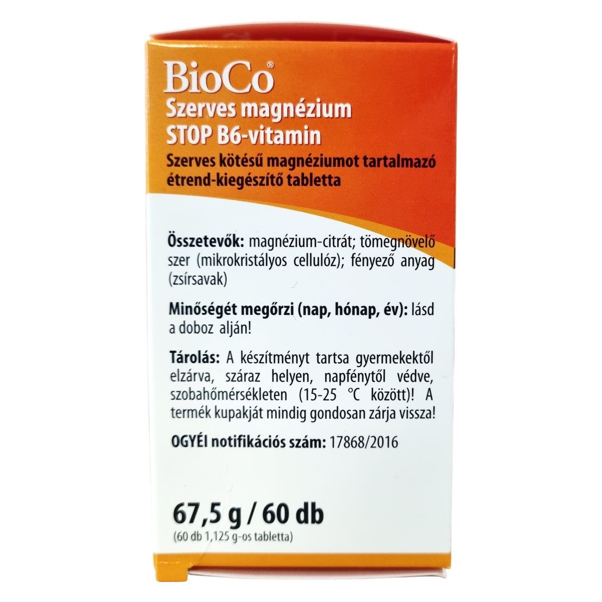 A BioCo Szerves magnézium STOP B6-vitamin tabletta kizárólag szerves kötésű magnéziumot tartalmaz (magnézium-citrát formában), amely jó hasznosulással rendelkezik. A termék nem tartalmaz B6-vitamint, így azoknak ajánlott, akik kerülni szeretnék ezt a vitamint az étrend-kiegészítés során. A magnézium hozzájárulhat az idegrendszer megfelelő működéséhez, normál izomműködéshez, a fáradtság és kifáradás csökkentéséhez, valamint a normál pszichológiai funkció fenntartásához. Részt vehet a normál csontozat és fogazat fenntartásában is. A készítmény Magyarországon fejlesztett és gyártott termék, annak ellenére, hogy a hatóanyag nem Magyarországról származik. A termék nem tartalmaz szervetlen magnézium vegyületeket, mint például magnézium-karbonát vagy magnézium-oxid.