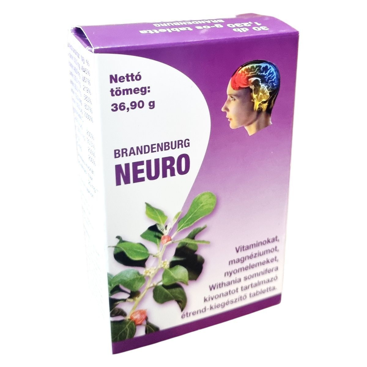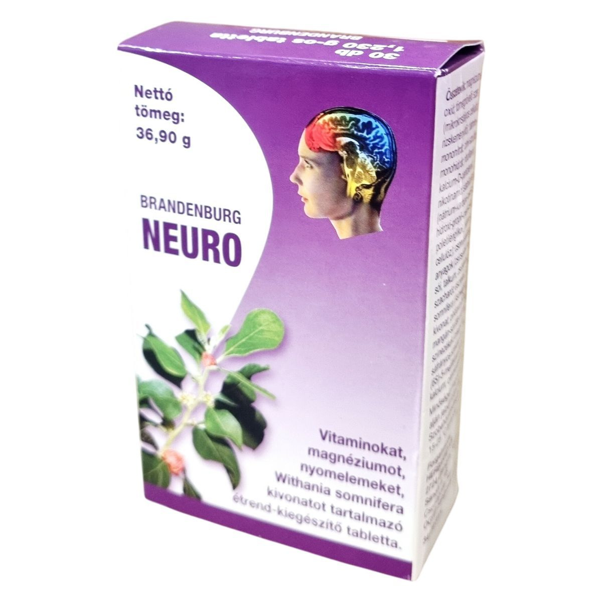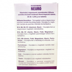 A BRANDENBURG NEURO étrend-kiegészítő tabletta 30 darab, egyenként 1,230 grammos tablettát tartalmaz. Hatóanyagai között szerepelnek B-vitaminok (B1, B2, B3, B5, B6, B12), folát, magnézium, cink, mangán, valamint a Withania somnifera (Ashwaganda) kivonat, mely támogatást nyújthat az idegrendszer számára mentális feszültség esetén és hozzájárulhat a megfelelő mentális és pszichés működés fenntartásához. A termék összetevői továbbá magnézium-oxid, különféle cellulózszármazékok, keményítő, stabilizátorok és színezékek. A termék minőségét a doboz alján jelzett időpontig őrzi meg. A fogyasztása nem helyettesíti a vegyes étrendet és az egészséges életmódot. Kisgyermekek, terhes és szoptató nők számára nem ajánlott. Forgalmazója a HERBRAND Kft., csomagolási hely az EU területe.