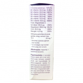 magnézium-oxid, mikrokristályos cellulóz, rizskeményítő, tiamin-mononitrát, cink-szulfát-monohidrát, riboflavin, kalcium-D-pantotenát, nikotinamid, nátrium-karboxi-metil-cellulóz, hidroxi-propil-metil-cellulóz, polietilénglikol, hidroxi-propil-cellulóz, zsírsavak magnézium sói, talkum, zsírsavak szacharóz észterei, Withania somnifera kivonat, piridoxin-hidroklorid, mangán-szulfát-monohidrát, céklavörös, sáfrányos szeklice, citrom, (6S)-5-metiltetrahidrofolsav kalcium, cianokobalamin