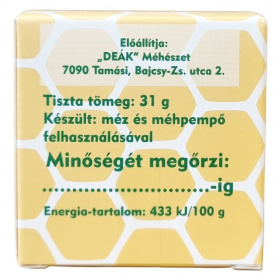 A termék tiszta tömege 31 gramm. A Méh Pempős Mézet a "DEÁK" Méhészet állítja elő, amelynek székhelye Tamásiban, a Bajcsy-Zs. utca 2. szám alatt található.