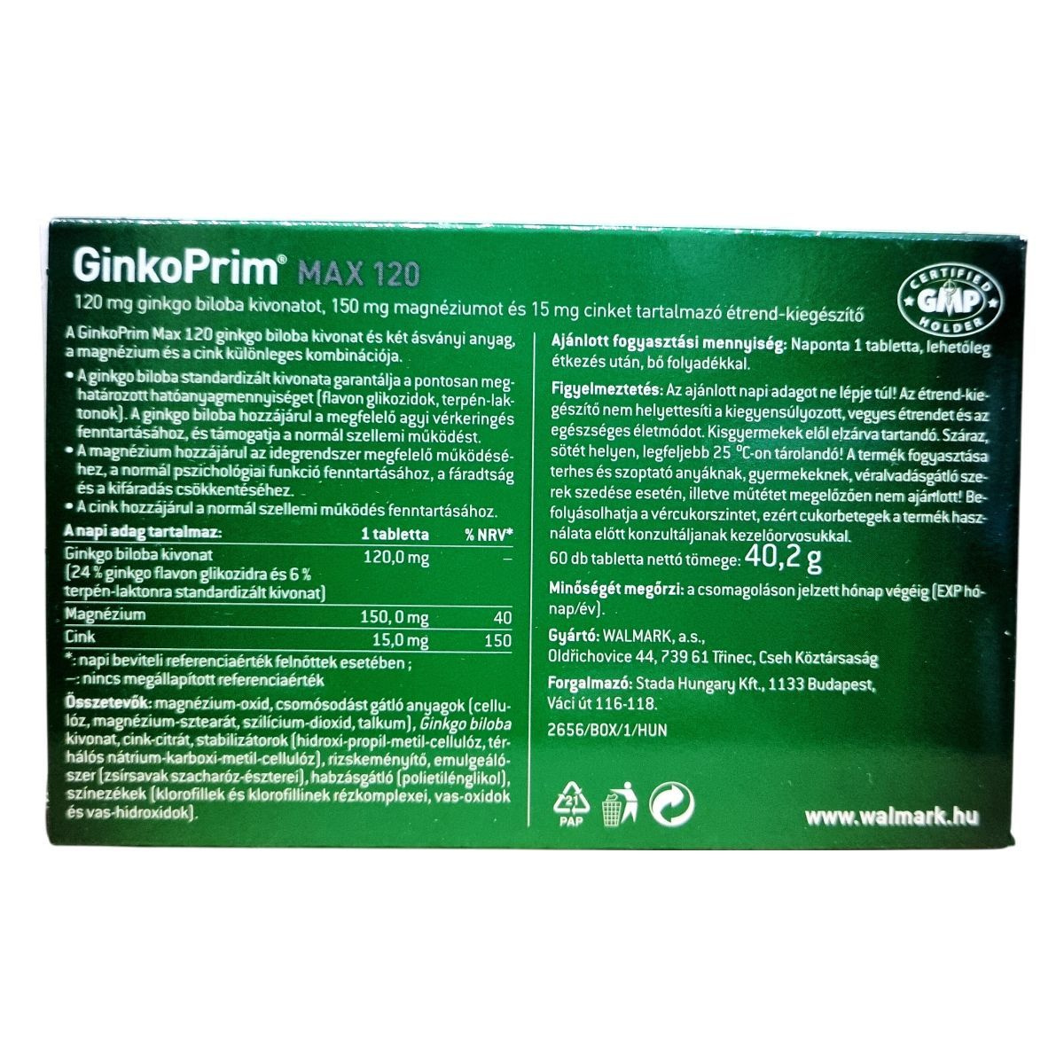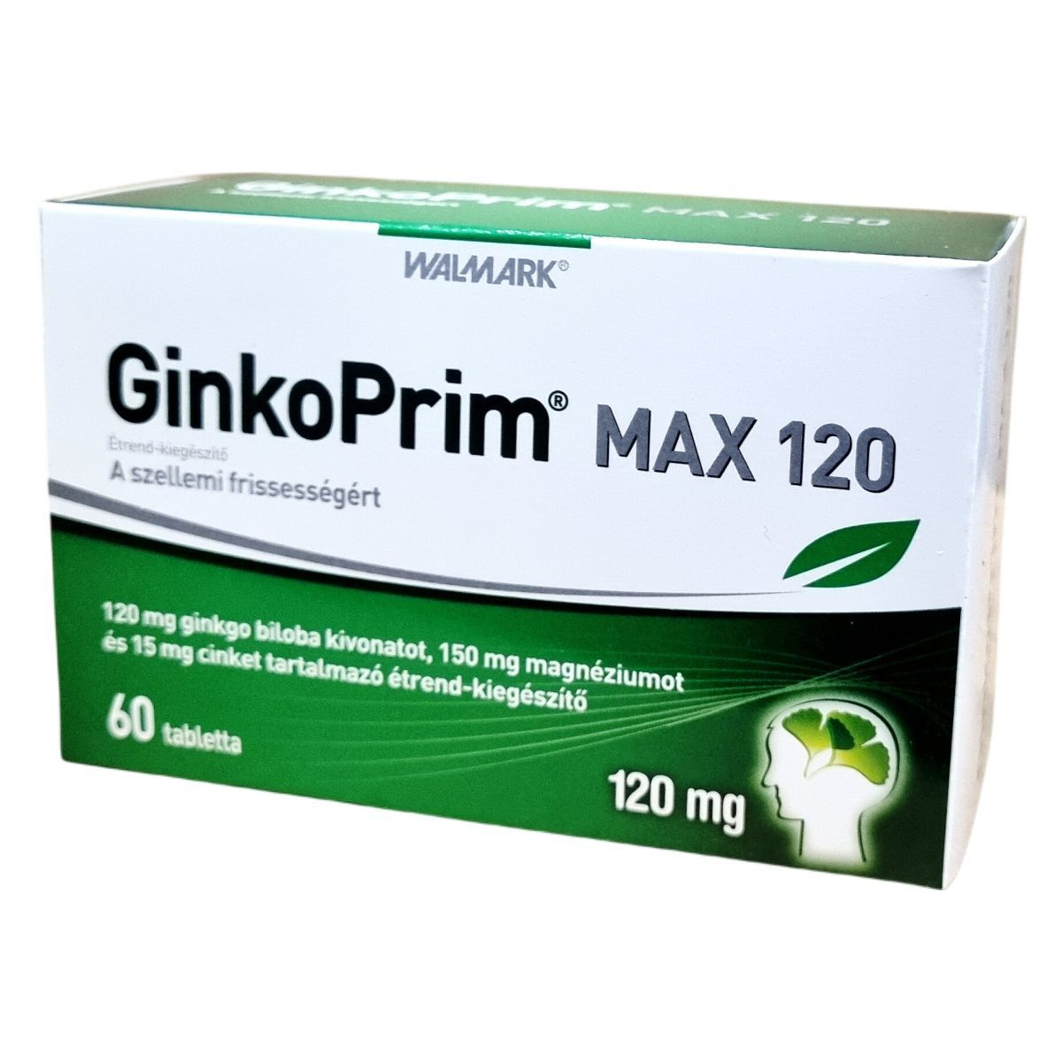 A GinkoPrim® MAX 120 egy étrend-kiegészítő, amely a szellemi frissesség támogatására készült. A termék 120 mg ginkgo biloba kivonatot tartalmaz, amely hozzájárulhat a megfelelő agyi vérkeringés fenntartásához és a normál szellemi működés támogatásához. A magnézium segíthet az idegrendszer megfelelő működésében, a normál pszichológiai funkció fenntartásában, valamint a fáradtság és kifáradás csökkentésében. A cink hozzájárulhat a normál szellemi működés fenntartásához. A termék 60 tablettát tartalmaz, és napi egy tabletta fogyasztása javasolt étkezés után, bő folyadékkal. Fontos, hogy az ajánlott napi adagot ne lépje túl, és a termék nem helyettesíti a kiegyensúlyozott étrendet és az egészséges életmódot.