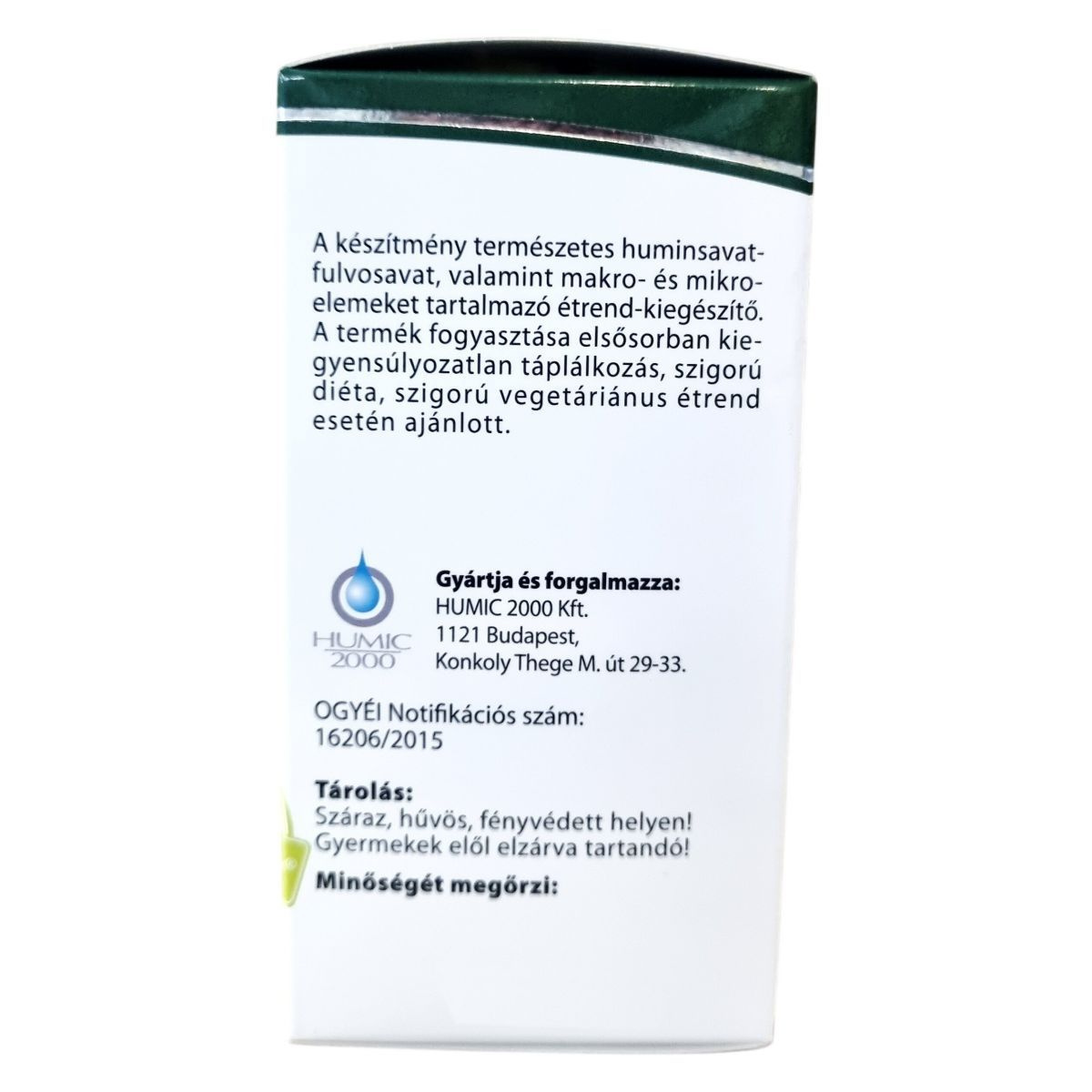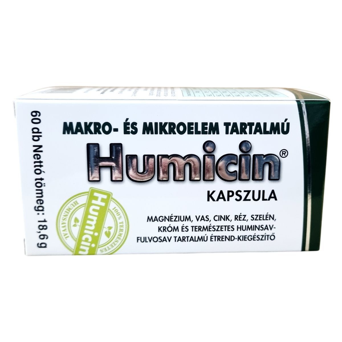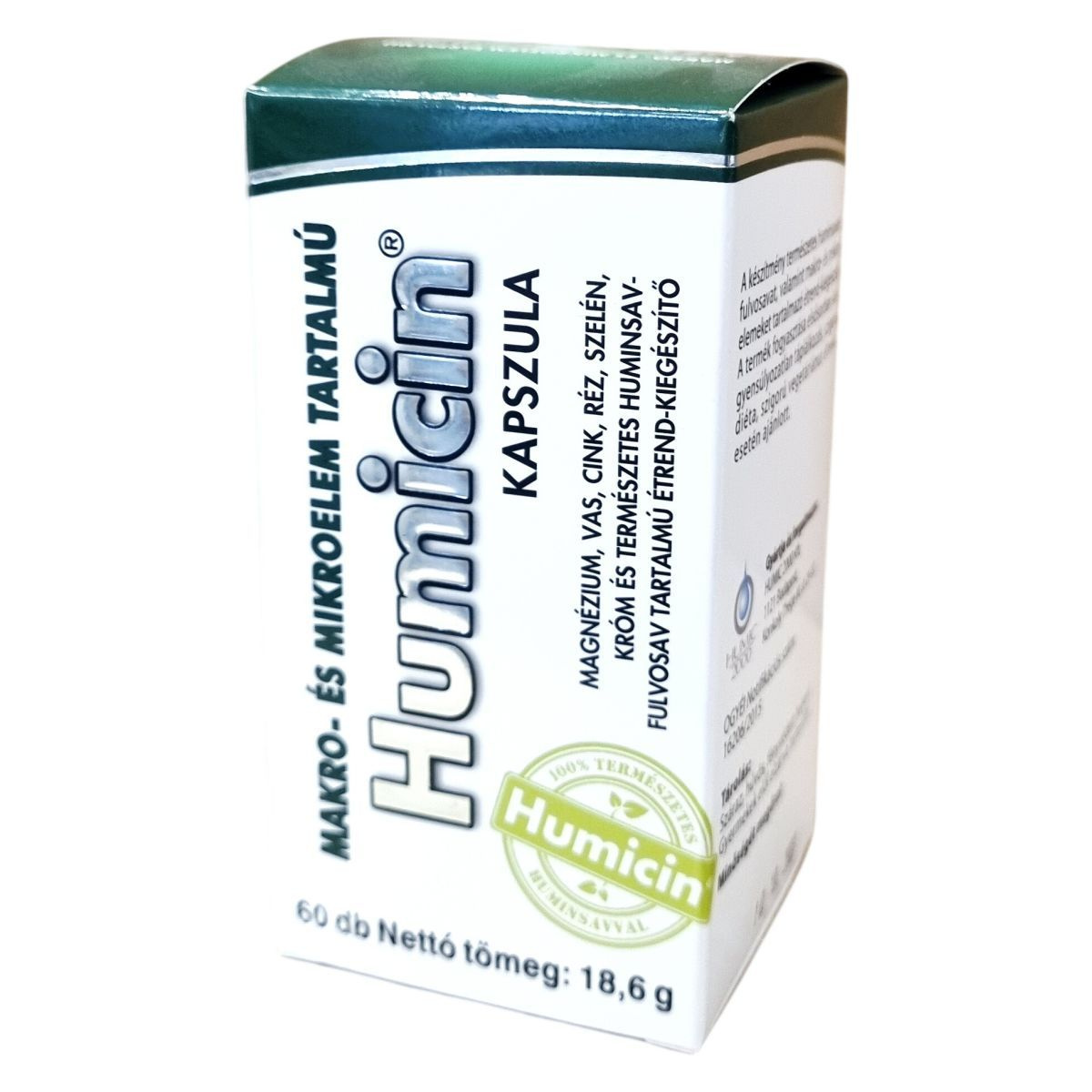 A Humicin® kapszula természetes huminsav-fulvosavat, valamint fontos makro- és mikroelemeket tartalmazó étrend-kiegészítő. Fogyasztása különösen ajánlott kiegyensúlyozatlan táplálkozás, szigorú diéta vagy vegetáriánus étrend esetén. A termék elősegítheti a szervezet megfelelő ásványianyag-ellátását, hozzájárulhat az egészséges életmód fenntartásához. Az adagolását és alkalmazását az ajánlások szerint szükséges betartani, és nem helyettesíti a változatos étrendet. A termék gyártója és forgalmazója a HUMIC 2000 Kft., a termék OGYÉI notifikációs számmal rendelkezik. Tárolását száraz, hűvös, fényvédett helyen kell végezni, gyermekek elől elzárva.