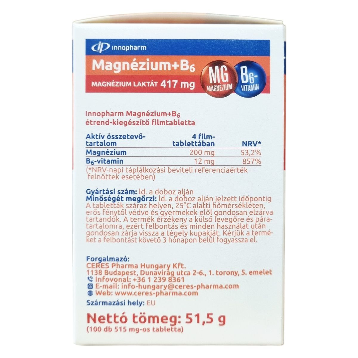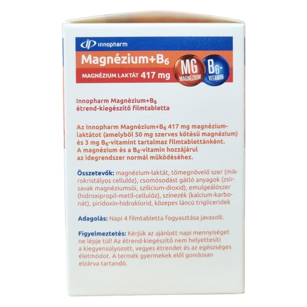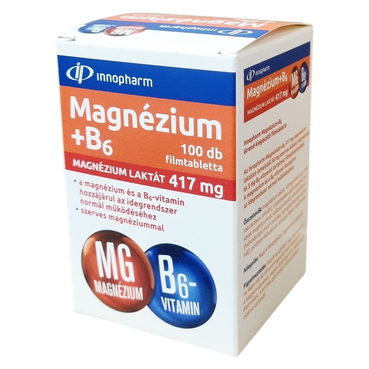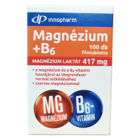 Az innopharm Magnézium+B6 étrend-kiegészítő filmtabletta magnézium-laktátot tartalmaz 417 mg mennyiségben, amelyből 50 mg szerves kötésű magnézium származik, valamint 3 mg B6-vitamint filmtablettánként. A magnézium és a B6-vitamin hozzájárulhat az idegrendszer normál működéséhez. A termék szerves magnéziumformát alkalmaz a jobb felszívódás érdekében. Az étrend-kiegészítő mindennapos használatra készült és könnyen adagolható tabletta formájában érhető el, nettó tömege 51,5 g. Magyarországon forgalmazott, EU-ban készült minőségi termék. A csomagban 100 db tabletta található, amelyeket gondosan kell tárolni a termék érzékenysége miatt. A termék biztosíthatja a szervezet számára szükséges magnézium és B6-vitamin pótlást, támogatva ezzel a normál idegműködést.