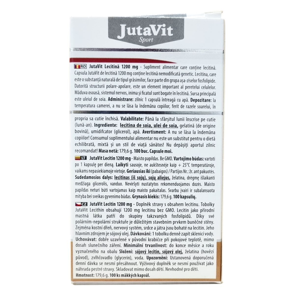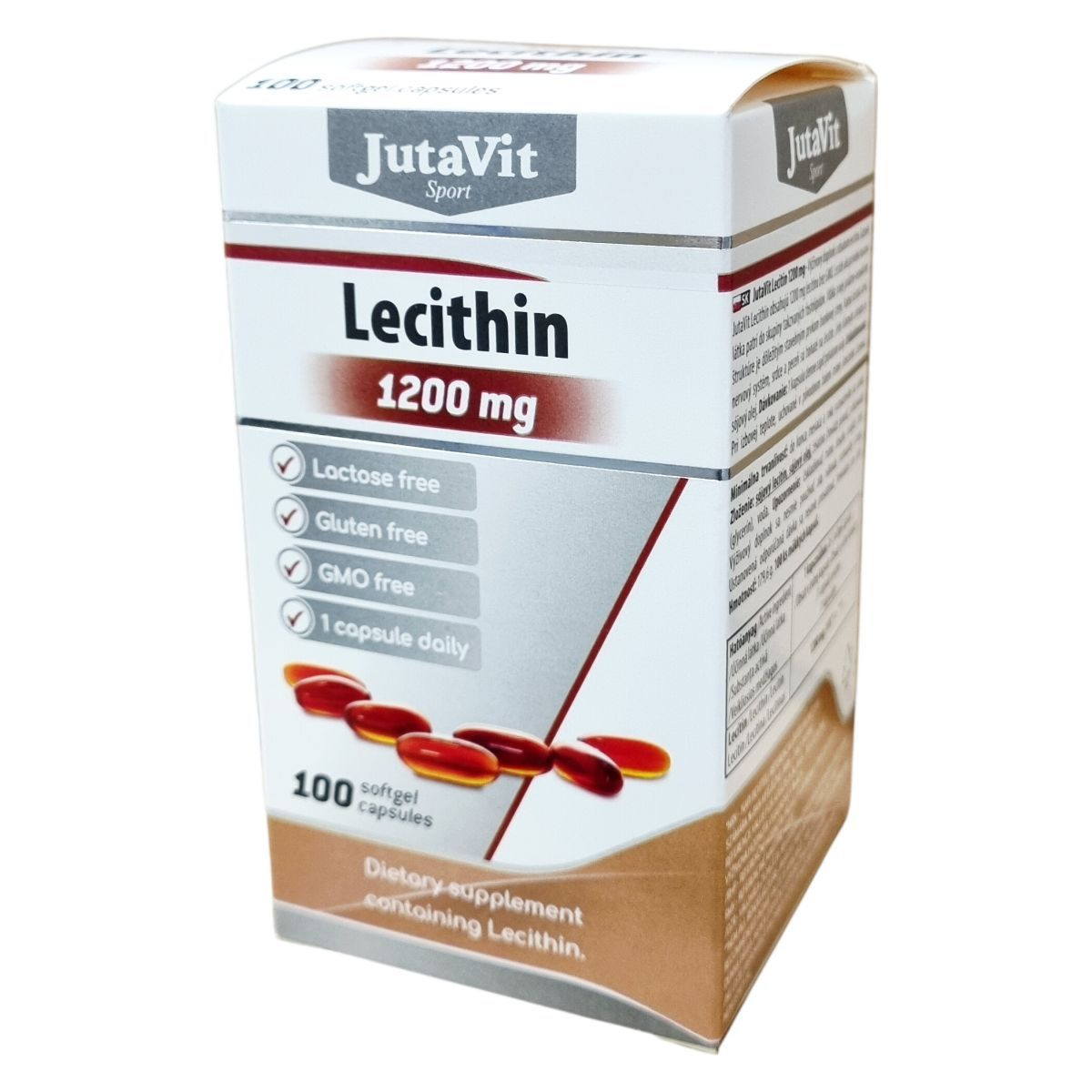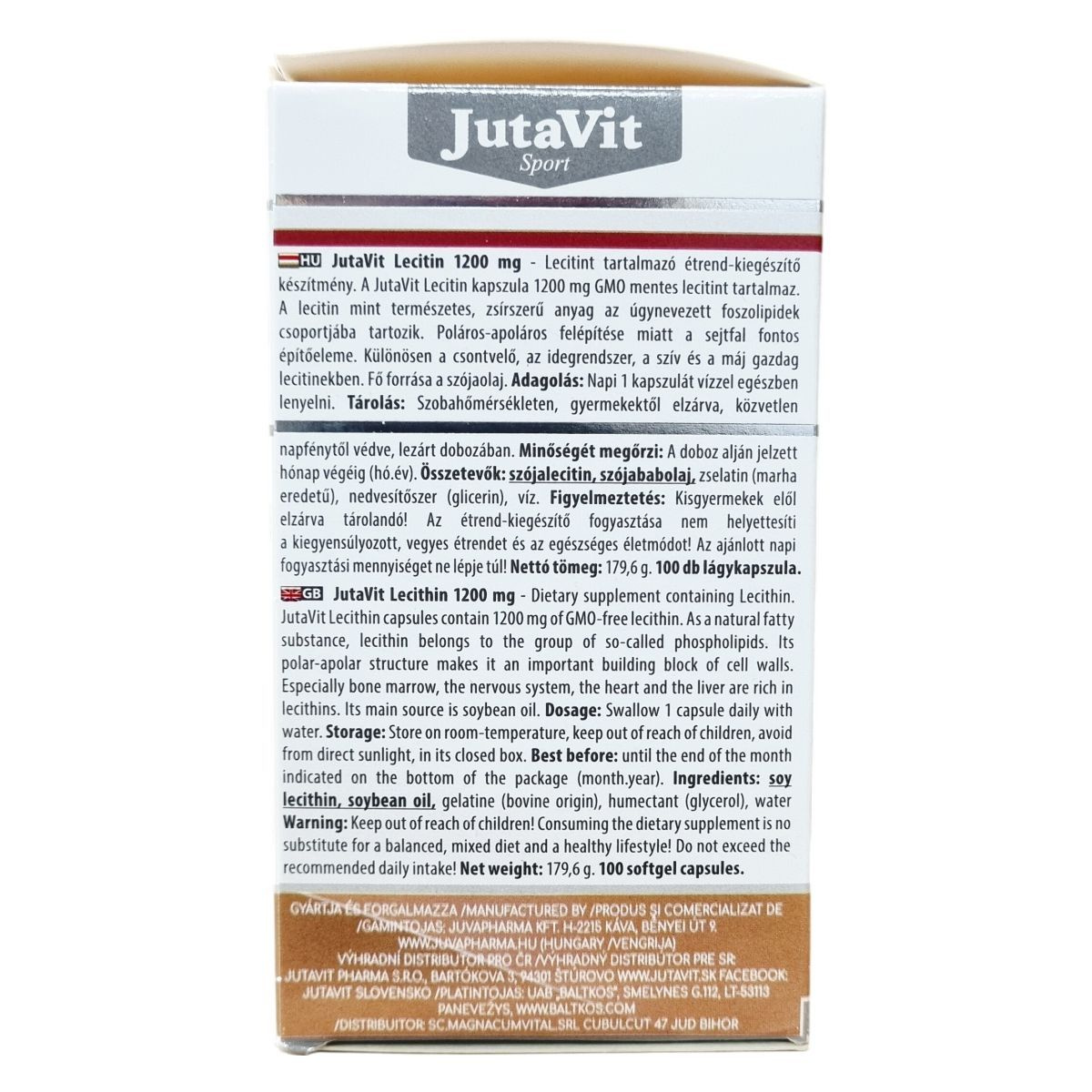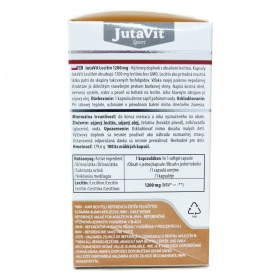 A JutaVit Lecitin kapszula 1200 mg GMO mentes lecitin tartalmú étrend-kiegészítő készítmény, amely a természetes zsírszerű anyagok, a foszfolipidek csoportjába tartozik. Poláros-apoláros szerkezete miatt a sejtfal fontos alkotórésze, különösen gazdag benne a csontvelő, az idegrendszer, a szív és a máj. A lecitin fő forrása a szójaolaj. A termék kizárólag természetes összetevőket tartalmaz, mint a szójalecitin, szójaolaj, marha eredetű zselatin, glicerin és víz. A termék 100 lágykapszulát tartalmaz, nettó tömege 179,6 g. Az adagolás napi 1 kapszula, mely vízzel egészben lenyelendő. A termék tárolása szobahőmérsékleten történjen, eredeti csomagolásban, gyermekektől elzárva, napfénytől védve. Az étrend-kiegészítő nem helyettesíti a változatos étrendet és az egészséges életmódot, és nem alkalmas gyermekek számára.