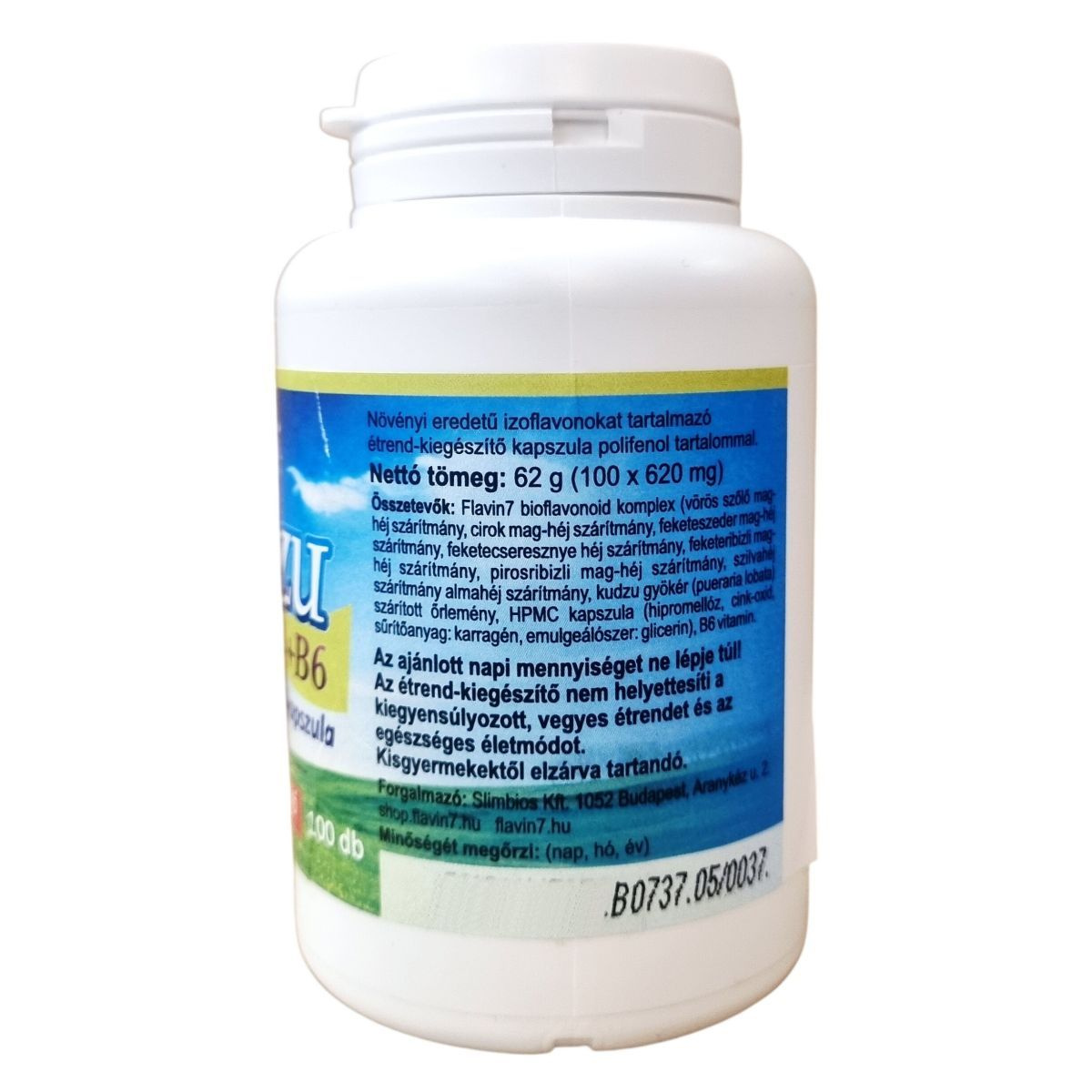 Flavin7 bioflavonoid komplex (vörös szőlő mag- héj szárítmány, cirok mag-héj szárítmány, feketeszeder mag- héj szárítmány, feketecseresznye héj szárítmány, feketeribizli mag- héj szárítmány, pirosribizli mag-héj szárítmány, szilvahéj szárítmány, almahéj szárítmány), kudzu gyökér (pueraria lobata) szárított őrlemény, HPMC kapszula (hipromellóz, cink-oxid, sűrítőanyag: karragén, emulgeálószer: glicerin), B6 vitamin