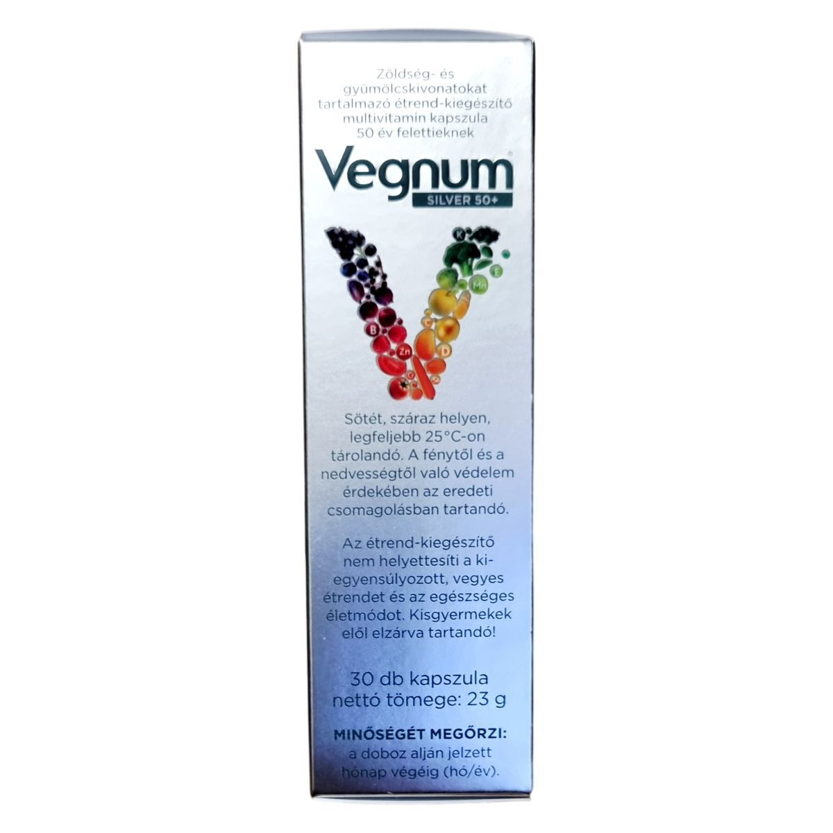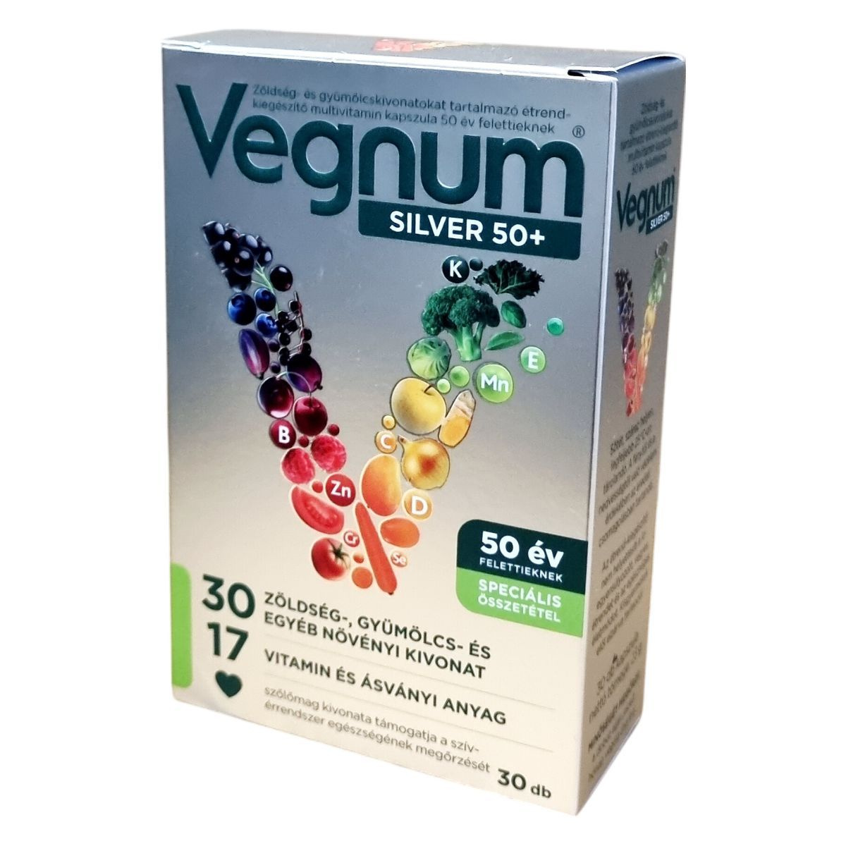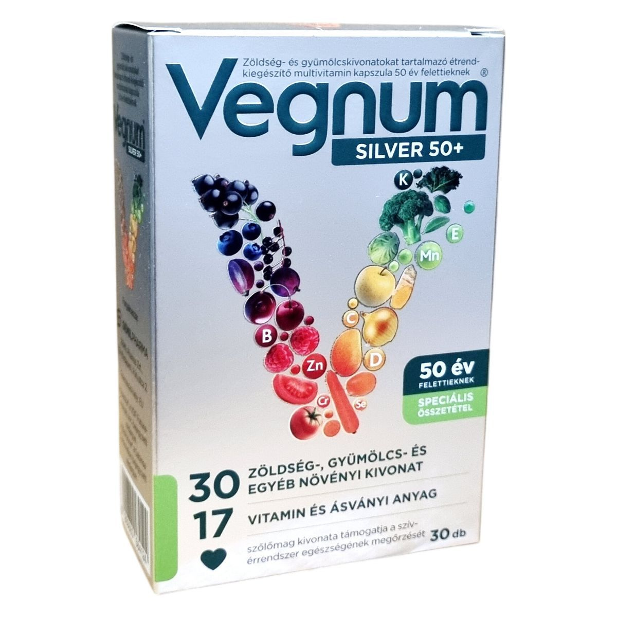 A Vegnum SILVER 50+ multivitamin kapszula kifejezetten 50 év felettiek számára készült, és antioxidánsokat tartalmazó zöldség-, gyümölcs- és egyéb kivonatokkal gazdagított. A termék 30 különböző növényi kivonatot, valamint 17 vitamint és ásványi anyagot tartalmazhat, amelyek hozzájárulhatnak az egészség megőrzéséhez. A szőlőmag kivonat proantocianidinben gazdag, ami támogathatja a szív- és érrendszer egészségét. A termék Spectra® és BioPerine® védjeggyel ellátott összetevőket is tartalmaz.