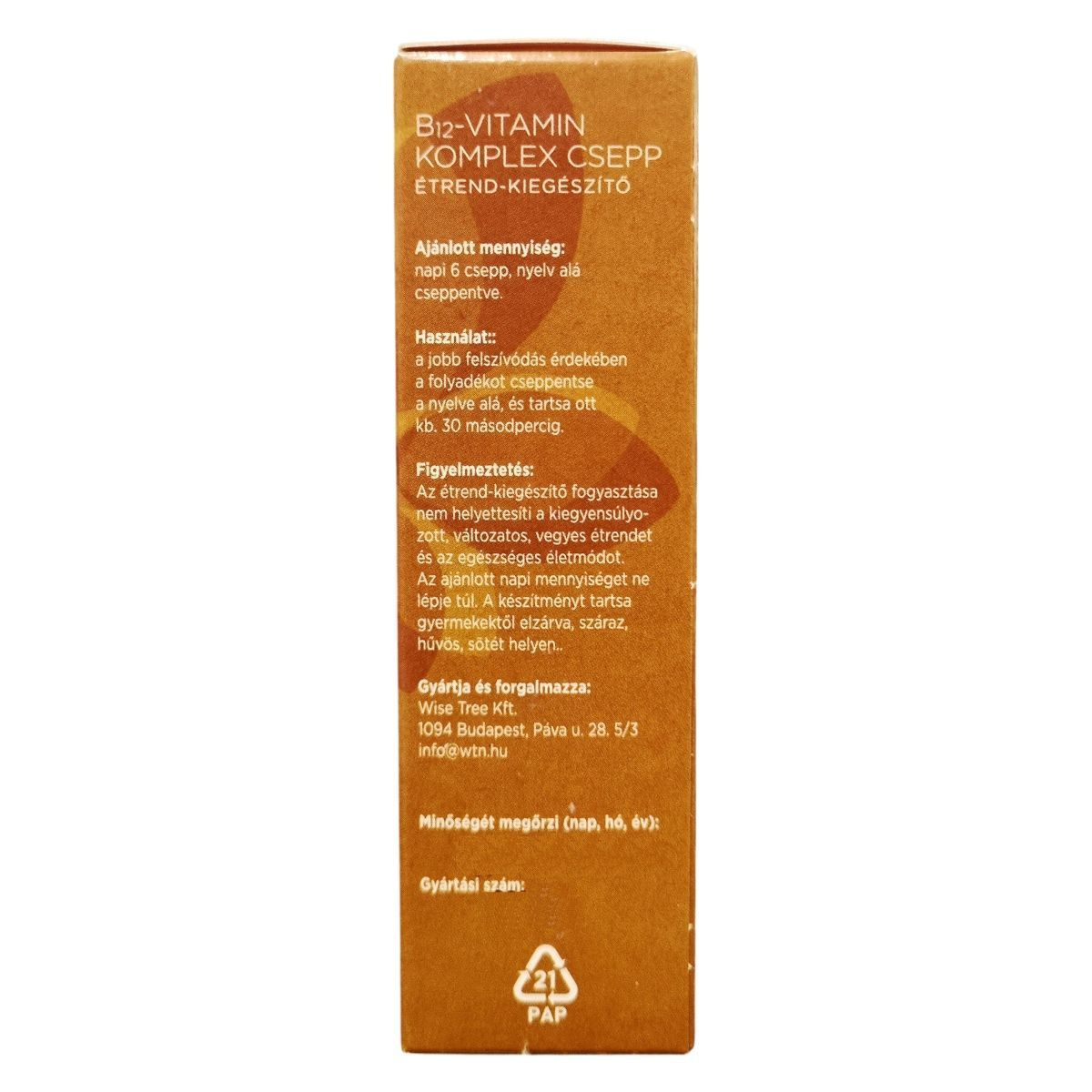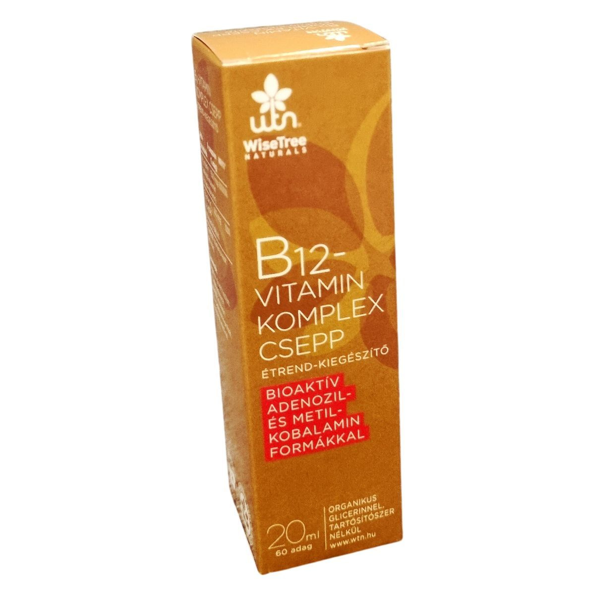 A WiseTree NATURALS B12-vitamin komplex csepp egy bioaktív adenozil- és metil-kobalamin formákat tartalmazó étrend-kiegészítő, amely organikus glicerinből készül, tartósítószer nélkül. A termék 20 ml-es kiszerelésű, és 60 adagot tartalmaz. A cseppet napi 6 cseppben javasolt alkalmazni, amelyet nyelv alá kell cseppenteni, majd körülbelül 30 másodpercig ott tartani a jobb felszívódás érdekében. Az összetevők között megtalálható a metil-kobalamin, az adenozil-kobalamin, valamint a 6(S)-L-metiltetrahidrofolát és inozitol-hexanikotinát is. A termék a B12-vitaminon kívül B9-vitamint is tartalmaz, amely L-5-MTHF formában van jelen. A készítményt a Wise Tree Kft. gyártja és forgalmazza. A termék fogyasztása nem helyettesíti a változatos, kiegyensúlyozott étrendet és az egészséges életmódot, továbbá fontos az ajánlott napi mennyiség betartása.