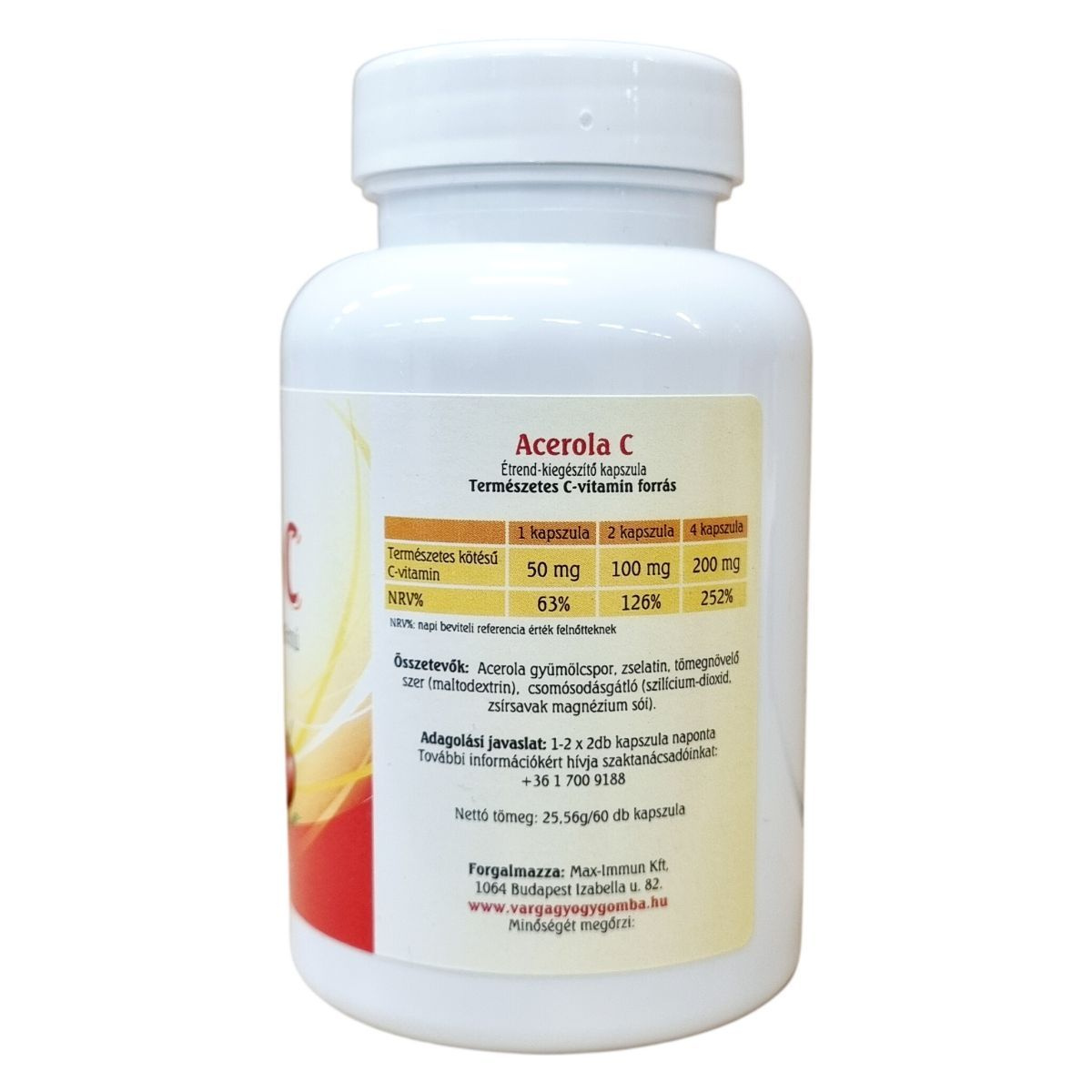 Acerola por-kivonat C-vitaminnal és ásványi anyagokkal. 50 mg C-vitamin kapszulánként.