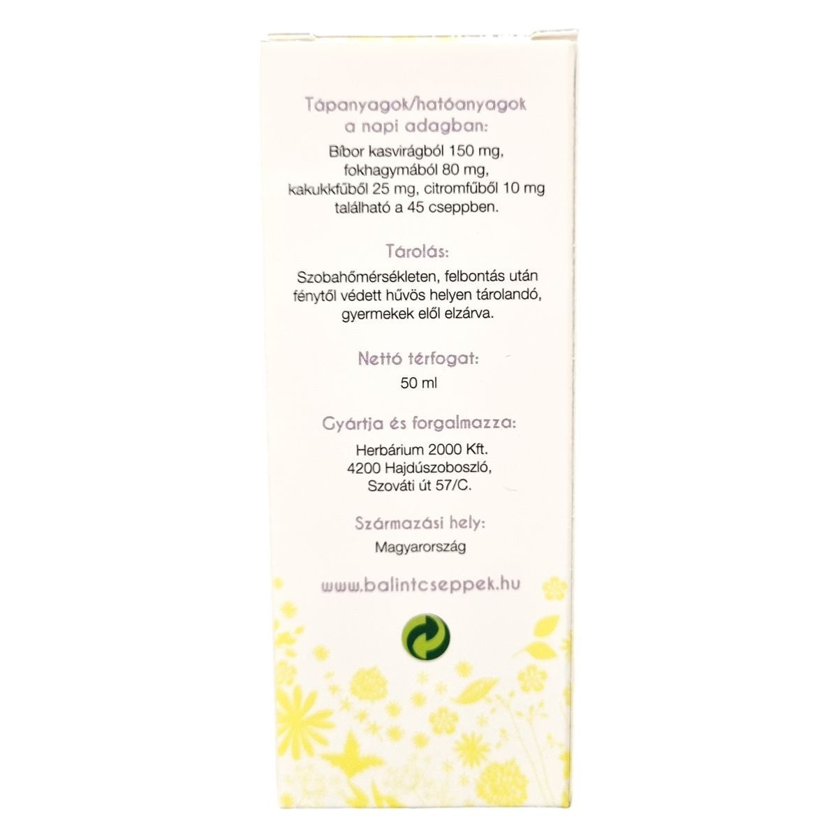 Folyékony étrend-kiegészítő készítmény több gyógynövény alkoholos-vizes kivonatával. A napi adag 45 csepp, amely meghatározott mennyiségben tartalmaz echinaceát, fokhagymát, kakukkfüvet és citromfüvet. A termékben üledékesség előfordulhat, amely nem befolyásolja a készítmény hatását. Származási hely: Magyarország.
