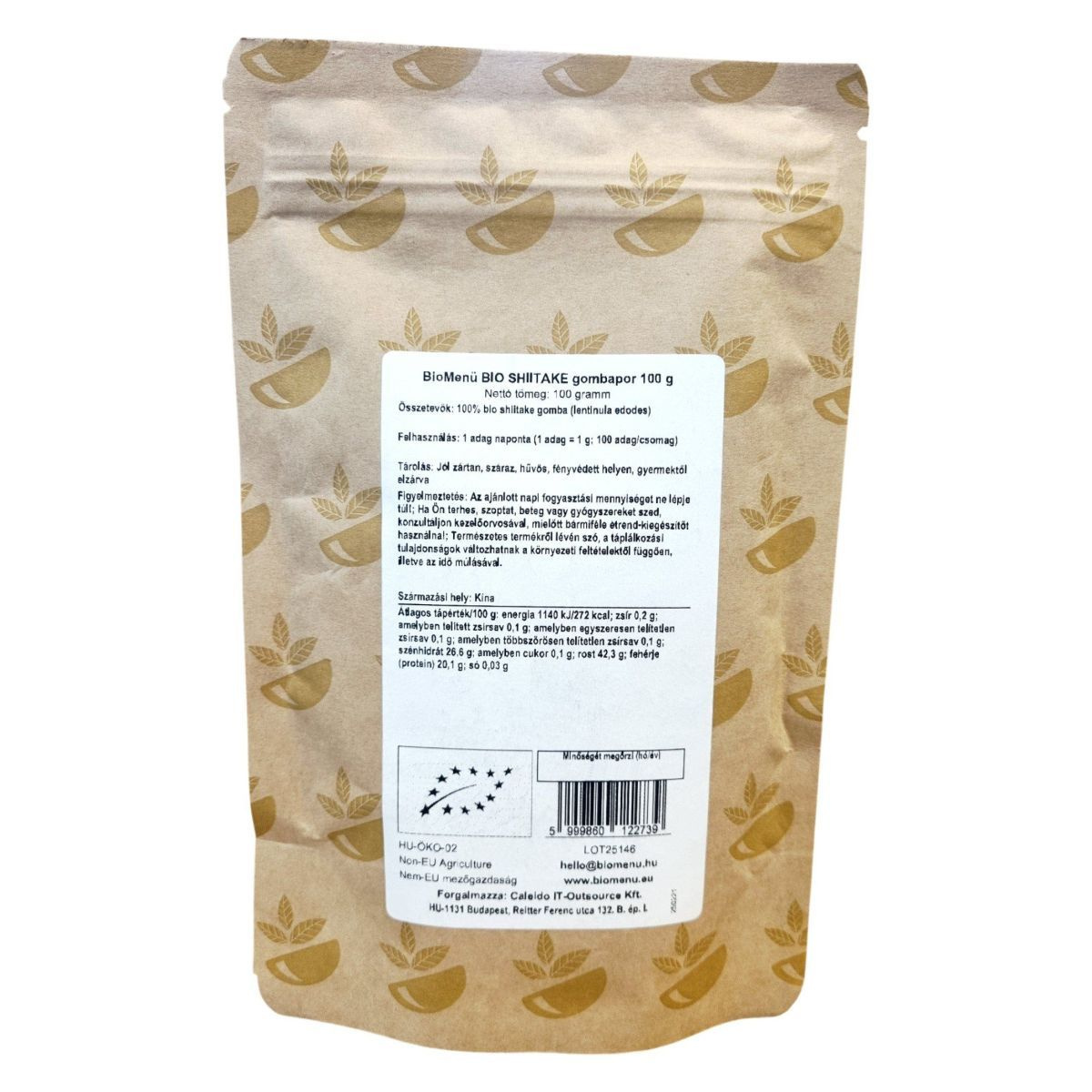 A BioMenü BIO SHIITAKE gombapor 100 g-os kiszerelésben kapható, és 100% bio shiitake gombát tartalmaz. A termék Kínából származik, és megfelel a bio, raw és vegán étrendi irányzatoknak. A termék energia- és tápérték adatai alapján alacsony zsír- és cukortartalmú, magas rost- és fehérjetartalmú lehet. A termék HU-ÖKO-02 tanúsítvánnyal rendelkezik, és a Caleldo IT-Outsource Kft. forgalmazza. A termék használata előtt javasolt konzultálni kezelőorvossal, különösen terhesség, szoptatás, betegség vagy gyógyszerszedés esetén.