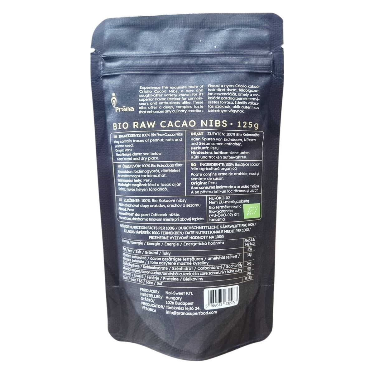 A Prāna Criollo kakaóbab töret egy különleges, nyers és bio minőségű termék Peruból származó alapanyagból. Ez a ritka kakaófajta mély, komplex ízvilágával emeli bármely kulináris alkotás színvonalát, kiváló választás ínyencek és autentikus ízek kedvelői számára. A termék gluténmentes, vegán és teljes egészében természetes összetevőket tartalmaz, így megfelel számos étrendi igénynek és életmódnak. Biogazdálkodásból származik, amit a Bio-Garancia (HU-ÖKO-02) tanúsít, biztosítva a minőséget és a fenntarthatóságot. Az ergonomikus, 125 grammos csomagolásban kapható kakaóbab töret tökéletes alapanyag különböző ételek, desszertek, turmixok és egészséges nassolnivalók készítéséhez.