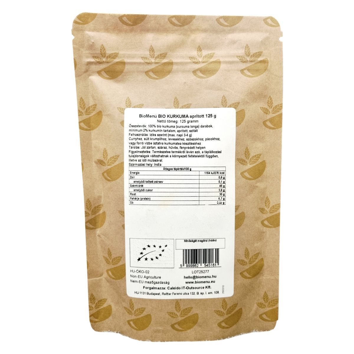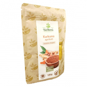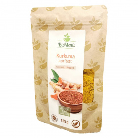 A BioMenü aprított kurkuma Indiából származik, és legalább 2% kurkumint tartalmaz. A termék szitált, így a fűszerek közé, de teaként is használható. Non-EU mezőgazdaságból származik, és megfelel a bio garanciának, valamint vegán termék. A tárolás körültekintést igényel, hogy megőrizze természetes tulajdonságait. A termék csomagolása 125 gramm nettó tömegű. Felhasználása rendkívül sokoldalú, a különböző ételek és italok ízesítésére egyaránt alkalmas.