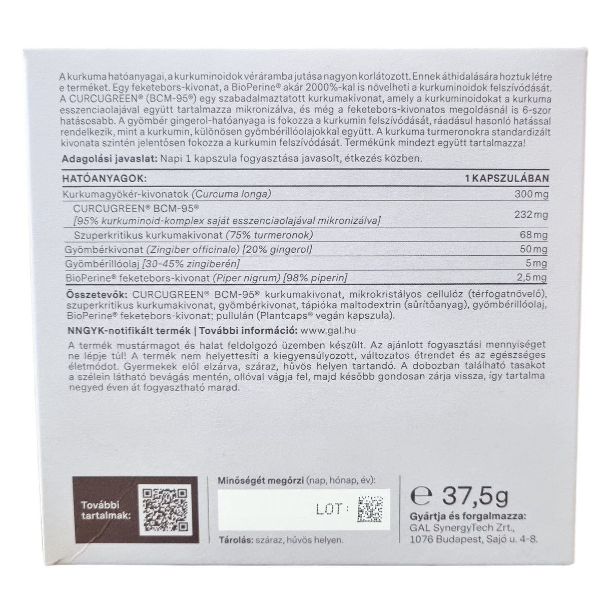 A kurkuma hatóanyagainak, a kurkuminoidoknak a véráramba jutása nagyon korlátozott, ezért ez a termék különleges összetételű. A BioPerine® feketebors-kivonat akár 2000%-kal is növelheti a kurkuminoidok felszívódását. A CURCUGREEN® (BCM-95®) egy szabadalmaztatott mikronizált kurkumakivonat, amely a kurkuminoidokat a kurkuma esszenciális olajával együtt tartalmazza, és hatékonysága a feketebors-kivonatos megoldásnál is hatszoros. A gyömbér gingerol-hatóanyaga fokozhatja a kurkumin felszívódását, ráadásul önmagában is hasonló hatással bír, különösen gyömbérillóolajjal együtt. Ezen kívül a kurkuma turmeronokra standardizált kivonata is jelentősen növelheti a kurkumin felszívódását. A Curcugreen Forte termék mindezeket az összetevőket együtt tartalmazza egy kapszulában, mikronizált és felszívódást segítő mátrixban. A termék cukor-, allergén-, glutén-, szója-, tejtermék-, laktóz- és GMO-mentes, valamint vegán. TÜV tanúsítással és ISO 9001:2015 szabvány szerinti minőségirányítási folyamatokkal készült. A csomagolás egy különleges tasakot tartalmaz, amelyet olló segítségével nyitható fel, majd gondosan visszazárható a frissesség megőrzése érdekében.