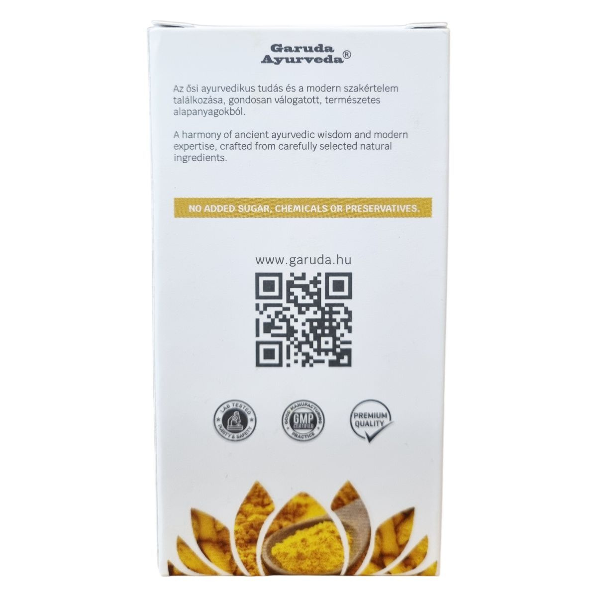 A Garuda Ayurveda® Kurkumin Extra készítmény az ősi ayurvedikus tudás és a modern szakértelem találkozásából született, gondosan válogatott természetes alapanyagok felhasználásával. A termék laboratóriumban tesztelt, garantált tisztaságú és biztonságú, GMP minőségű. A növényi kivonatú kapszulák 500 mg kurkuma-kivonatot tartalmaznak, melynek por és extraktum aránya 10:1. A termék nem tartalmaz hozzáadott cukrot, vegán kapszulában érhető el. Felhasználása során a gyulladáscsökkentő hatások révén támogathatja a szervezet válaszreakcióit, különösen az ízületek és izmok területén. A terméket kisgyermekek elől elzárva kell tartani, és nem helyettesíti a változatos, egészséges étrendet és életmódot. Export célokra készült, Indiai eredetű termék.