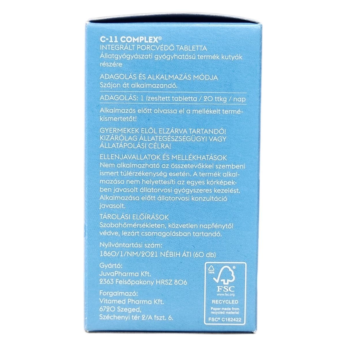 A VITAMED C-11® COMPLEX integrált porcvédő tabletta kizárólag kutyák részére készült, így segítheti az ízületi és porckárosodások kiegészítő kezelését, valamint a porcfejlődést kölyökkutyák növekedési időszakában. A termék hozzájárulhat a kutyák egészséges ízületi működésének támogatásához, az inak, szalagok, ízületi tok, kötőszövet és ízületi nedv regenerációjához, továbbá ízületi műtétek előtt és után is alkalmazható a regeneráció segítésére. Szájon át kell adni, az ajánlott adagolás 1 ízesített tabletta 20 testtömeg-kilogrammonként naponta. Az alkalmazás előtt javasolt a termékinformáció elolvasása és állatorvosi konzultáció. A készítmény nem helyettesíti az állatorvosi gyógyszereket, és az ismert túlérzékenység esetén nem szabad használni. A termék kizárólag állategészségügyi vagy állatápolási célokra szolgál, gyermekektől elzárva kell tartani.