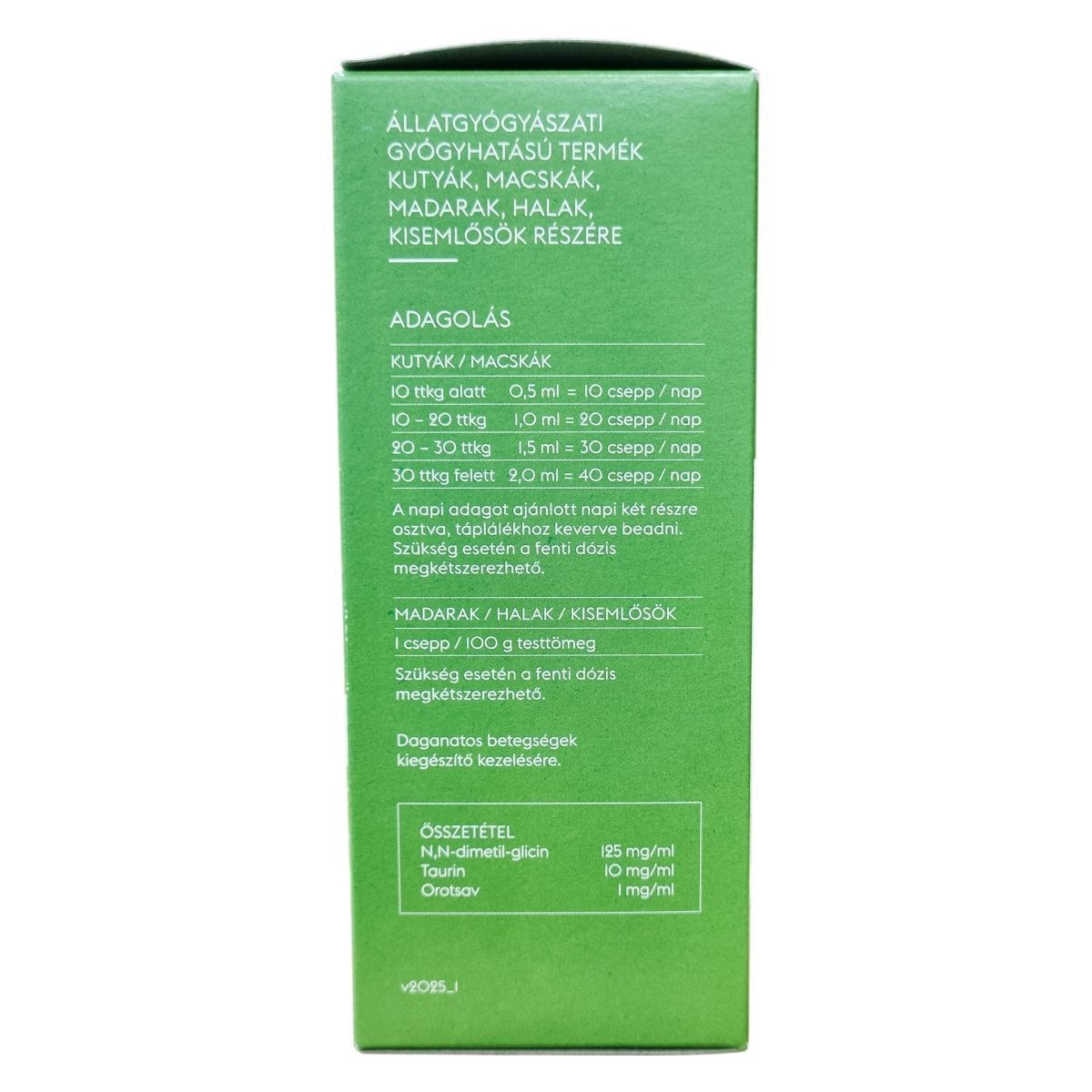 1 csepp / 100 g testtömeg naponta, szükség esetén megkétszerezhető.