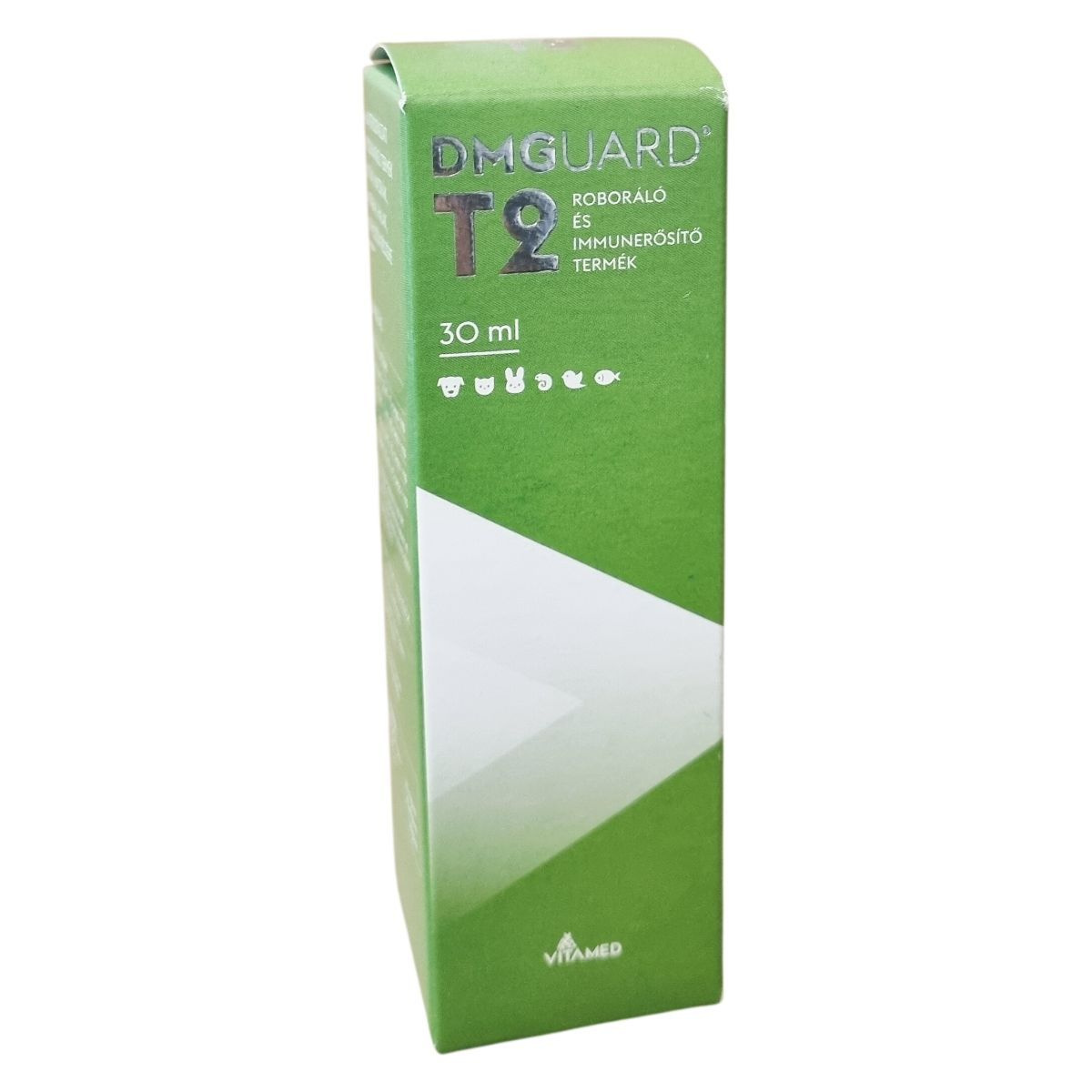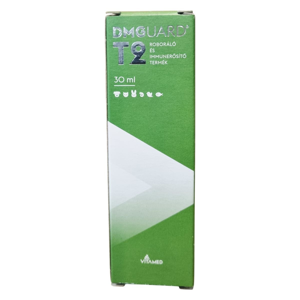 A DMGUARD® T2 egy 30 ml-es roboráló és immunerősítő termék kutyák, macskák, madarak, halak és kisemlősök részére. A termékben a kristályosodás természetes folyamat, amely nem befolyásolja a minőséget vagy a felhasználhatóságot. Az oldat színe és szaga gyártási tételenként változhat anélkül, hogy ez hatással lenne a termék minőségére vagy hatékonyságára. A napi adag ajánlott napi két részre osztva, táplálékhoz keverve adandó, szükség esetén megkétszerezhető. A készítmény daganatos betegségek kiegészítő kezelésére is alkalmazható.