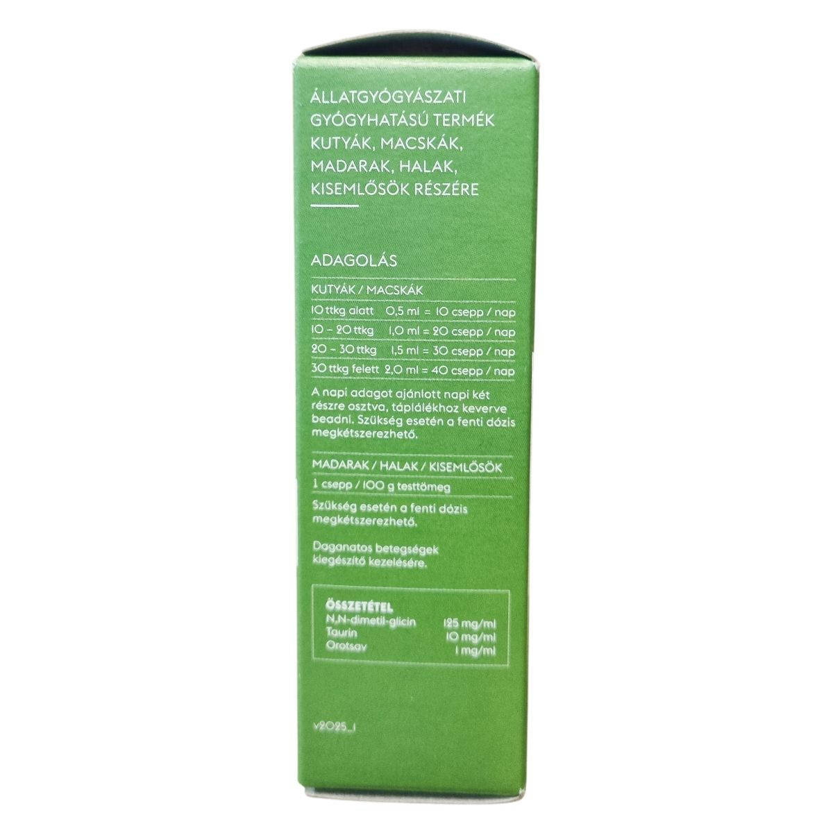 Kutyák, macskák: 10 testtömeg-kilogramm alatt 0,5 ml (10 csepp)/nap, 10-20 ttkg 1,0 ml (20 csepp)/nap, 20-30 ttkg 1,5 ml (30 csepp)/nap, 30 ttkg felett 2,0 ml (40 csepp)/nap. Napi adag két részre osztva, táplálékhoz keverve adandó. Szükség esetén a dózis megkétszerezhető.