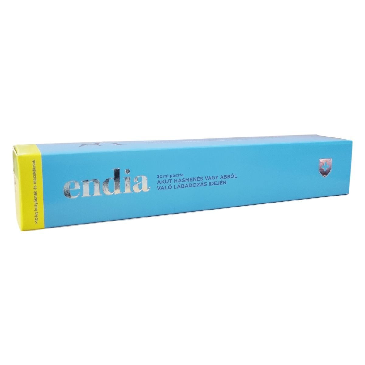 Az Endia egy 30 ml-es paszta formájú termék, amit 10 kg feletti kutyák és macskák számára fejlesztettek ki. Használata akut hasmenés vagy az abból való lábadozás időszakában javasolt. A készítmény összetevői között megtalálható többek között montmorillonit, prebiotikumok és aktív szén, amelyek támogathatják a bélflóra egyensúlyát és a gyomor-bél traktus egészségét. Az étrend kiegészítő alkalmazása előtt mindenképpen érdemes állatorvosi tanácsot kérni. A termék gyártója a Newborn Animal Care Franciaországban, forgalmazója pedig a Vitamed Pharma Kft.