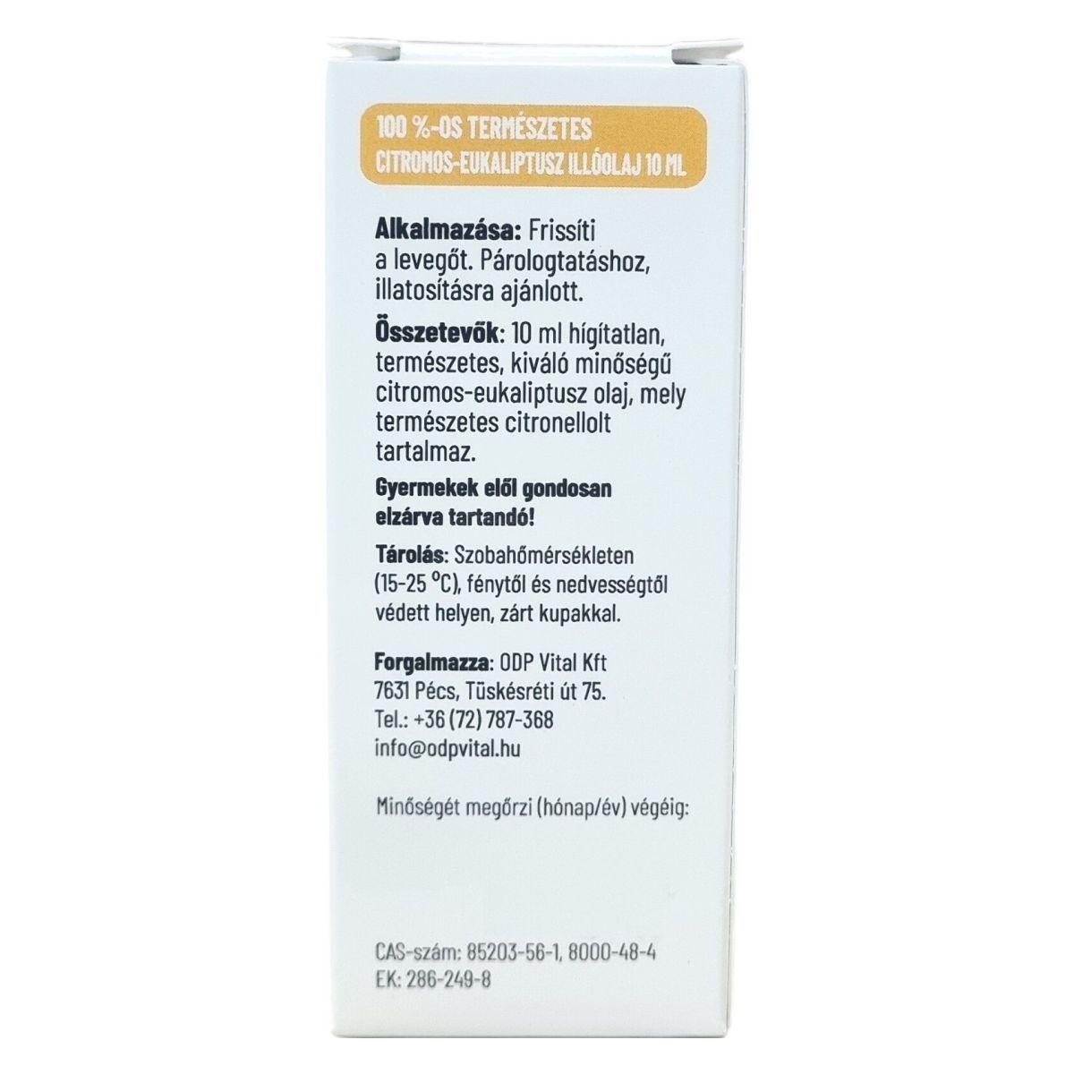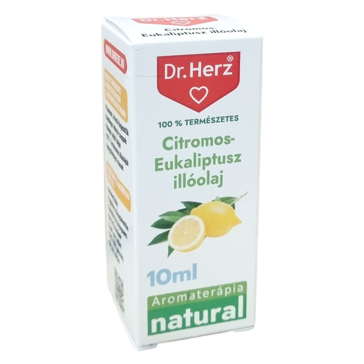 A Dr.Herz 100% természetes citromos-eukaliptusz illóolaj kiváló minőségű, hígítatlan olaj, mely természetes citronellolt tartalmaz. Aromaterápiás célokra alkalmas, ideális a levegő frissítésére párologtatással vagy illatosítással. Használata során fontos a bőrreakciók elkerülése érdekében a megfelelő védőfelszerelés alkalmazása. A terméket szobahőmérsékleten, fénytől és nedvességtől védve, gyermekek elől elzárva kell tárolni. Termékcsaládunkban megtalálhatók még vitaminok, étrend-kiegészítők, belsőleges oldatos cseppek, hidegen sajtolt olajok, valamint gyógynövényes krémek is, melyek többféle egészségügyi területet támogatnak.