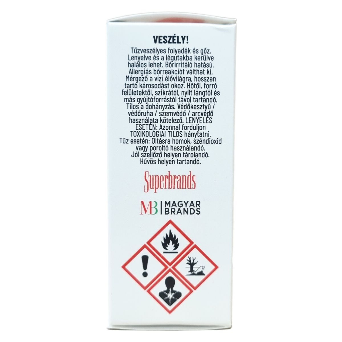 Tűzveszélyes folyadék és gőz. Lenyelve és a légutakba kerülve halálos lehet. Bőrirritáló hatású. Hőtől, forró felületektől, szikrától, nyílt lángtól és más gyújtóforrástól távol tartandó, tilos a dohányzás. Védőkesztyű, védőruha, szemvédő és arcvédő használata kötelező. Lenyelés esetén azonnal forduljon toxikológiai szakemberhez, hánytatni tilos. Tűz esetén homokkal, széndioxiddal vagy poroltóval oltandó. Mérgező a vízi élővilágra, hosszan tartó károsodást okoz.