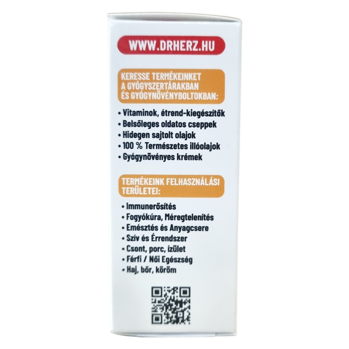 A Dr.Herz® 100% természetes szegfűszeg illóolaj egy kiváló minőségű, hígítatlan olaj, amely természetes eugenolt tartalmaz. Kiváló választás kedvező aromaterápiás élményhez és a levegő kellemes frissítéséhez. Ez a termék gyógyszertárakban és gyógynövényboltokban is elérhető, ahol a Dr.Herz márka széles választékából választhat vitaminokat, étrend-kiegészítőket, belsőleges oldatos cseppeket, hidegen sajtolt olajokat, illetve gyógynövényes krémeket is. Termékeik számos egészségügyi területet fednek le, többek között az immunerősítést, fogyókúrát, méregtelenítést, emésztést és anyagcserét, szív- és érrendszeri, csont-, porc- és ízületi, valamint férfi- és női egészségügyi támogatást, továbbá haj-, bőr- és körömápolást is.
