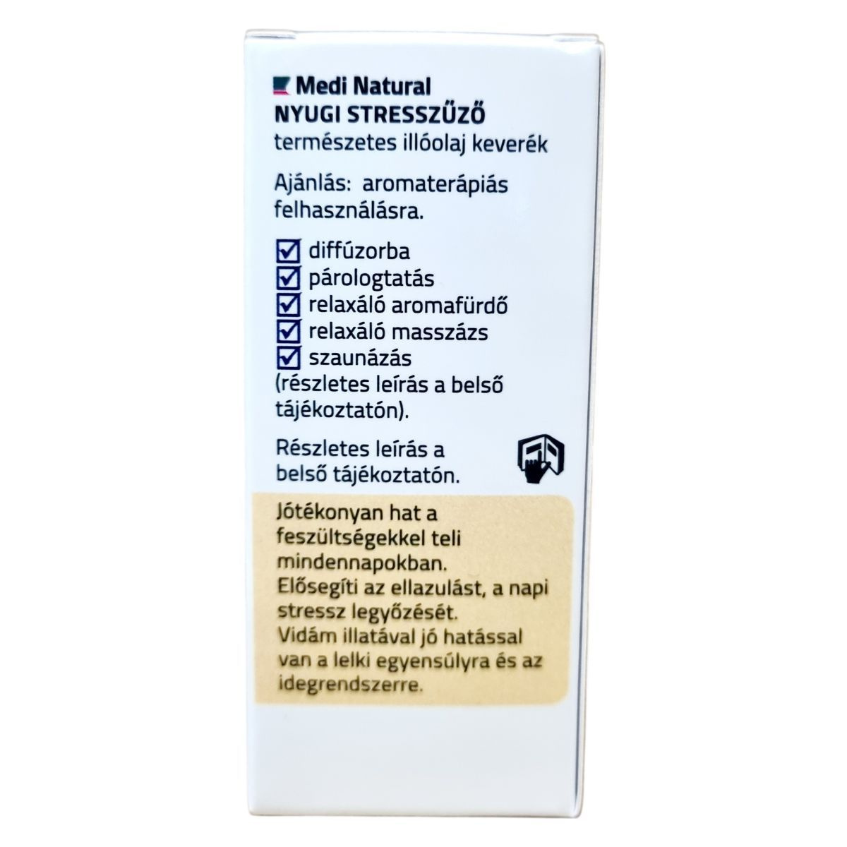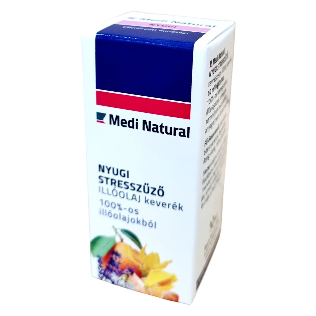 A Medi Natural NYUGI STRESSZŰZŐ természetes illóolaj keverék 10 ml hígítatlan, 100%-ban természetes illóolajokból áll, melyek semmilyen hozzáadott anyagot nem tartalmaznak. A fő összetevők között megtalálható a mandarin, édes narancs, levendula, ilang-ilang és római kamilla, amelyek harmonikus, vidám citrusos és virágos illatot biztosítanak. Ez az illat együttesen segít pihenni, oldani a feszültséget, támogatja a lelki egyensúlyt és az idegrendszer megnyugtatását. A termék aromaterápiás alkalmazásra készült, többféle használati módja ismert, például diffúzorba vagy párologtatáshoz, relaxáló aromafürdőhöz, masszázshoz és szaunázáshoz egyaránt használható. A részletes használati útmutató a csomagolás belső tájékoztatójában található.