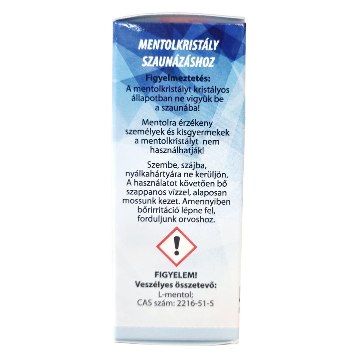 A mentolkristályt kristályos állapotban ne vigyük be a szaunába! Mentolra érzékeny személyek és kisgyermekek nem használhatják. Szembe, szájba és nyálkahártyára ne kerüljön. Használat után bő szappanos vízzel alaposan mossunk kezet. Bőrirritáció esetén orvoshoz kell fordulni.