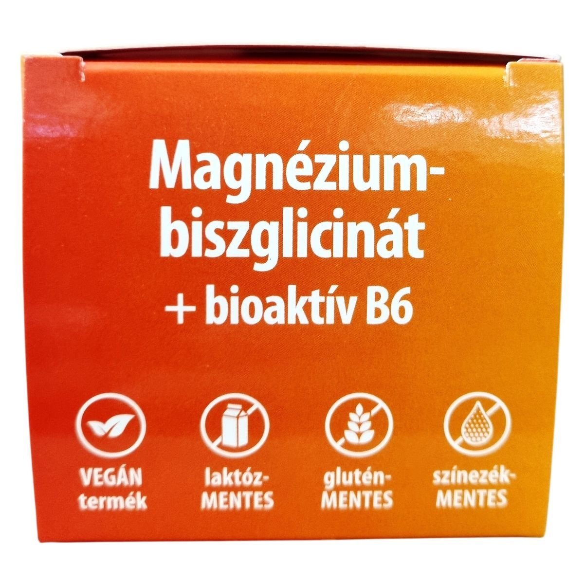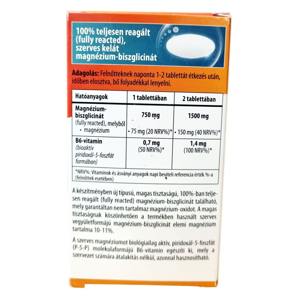 Teljesen reagált magnézium-biszglicinátot és bioaktív B6-vitamint tartalmazó étrend-kiegészítő tabletta.