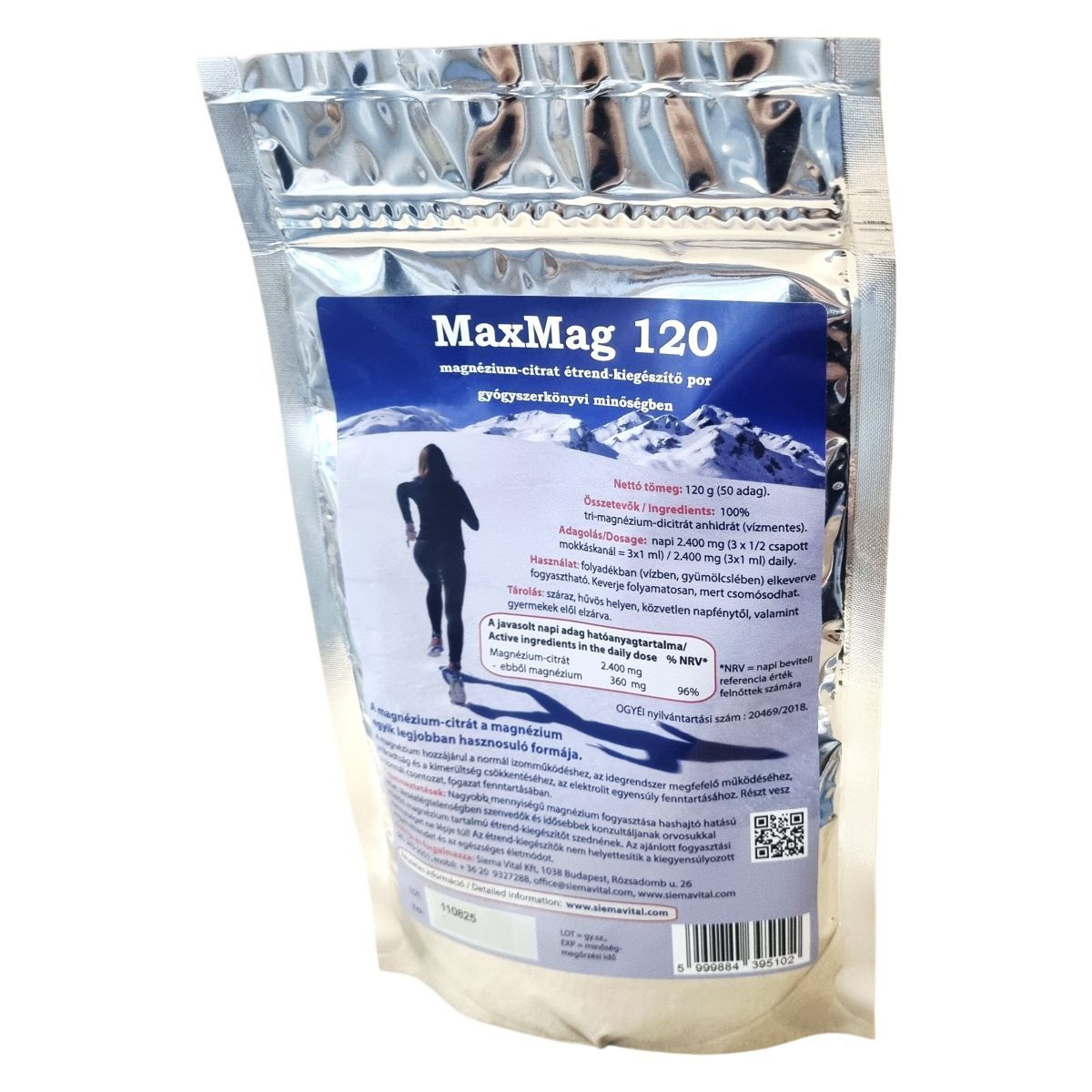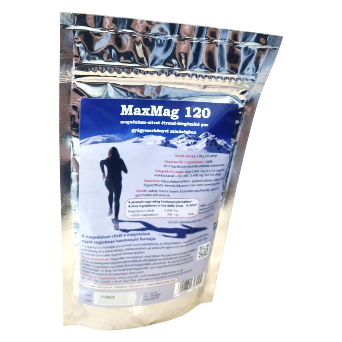 A MaxMag magnézium-citráttartalmú étrend-kiegészítő por gyógyszerkönyvi minőségű, vízmentes tri-magnézium-dicitrát anhidrátot tartalmaz. A termék 120 g nettó tömeggel, 50 adaggal kerül forgalomba. Használata során a javasolt adagot folyadékban (vízben vagy gyümölcslében) kell elkeverni, folyamatos keverés mellett a csomósodás elkerülése érdekében. A magnézium-citrát a magnézium egyik legjobban hasznosuló formája, amely hozzájárulhat a normál izomműködéshez, az idegrendszer megfelelő működéséhez, a fáradtság és kimerültség csökkentéséhez, az elektrolit egyensúly fenntartásához, valamint részt vehet a normál csontozat és fogazat fenntartásában. A terméket száraz, hűvös helyen, közvetlen napfénytől és gyermekektől elzárva kell tárolni. A nagyobb mennyiségű magnézium fogyasztás hashajtó hatású lehet. Veseelégtelenségben szenvedők és idősebb személyek számára fogyasztás előtt orvosi tanács javasolt. Az ajánlott mennyiség túllépése nem ajánlott, valamint az étrend-kiegészítők nem helyettesítik a változatos, kiegyensúlyozott étrendet és az egészséges életmódot.
