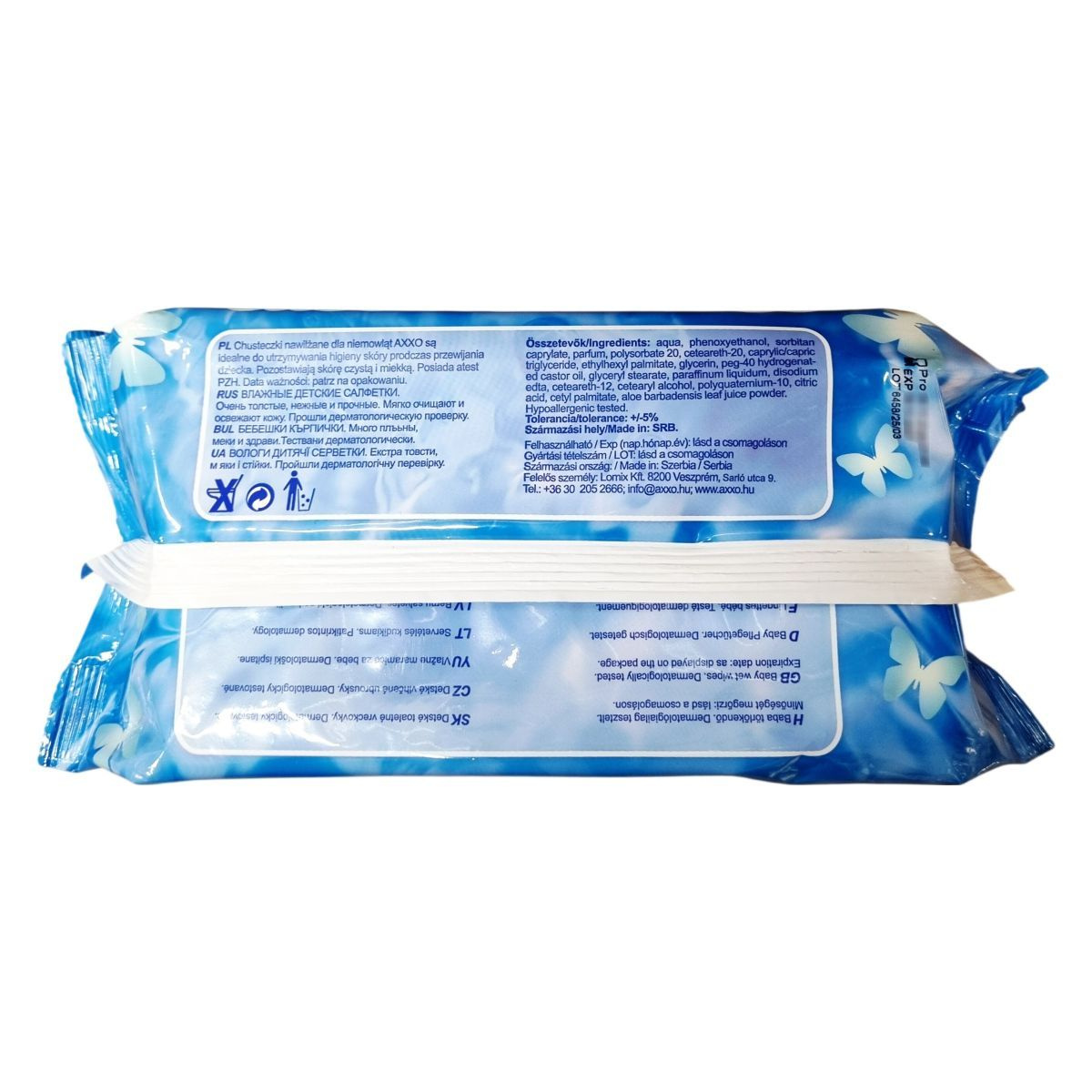 Az AXXO baba törlőkendő a bőr ápolására és tisztán tartására készült puha, erős, extra vastag kendő, mely gyengéden tisztítja és frissíti a baba bőrét. A termék Szerbiában készült, dermatológiailag tesztelt és hipoallergén, így alkalmas a legérzékenyebb bőr ápolására is. A kendő hidratáló összetevőket tartalmaz, amelyek hozzájárulnak a bőr puhaságához és megfelelő védelméhez. A termék alkalmas a baba bőrének higiénikus ápolására pelenkacsere közben, megőrizve annak tisztaságát és komfortját. Használata mellett a baba bőre tiszta, puha és friss érzetű marad.