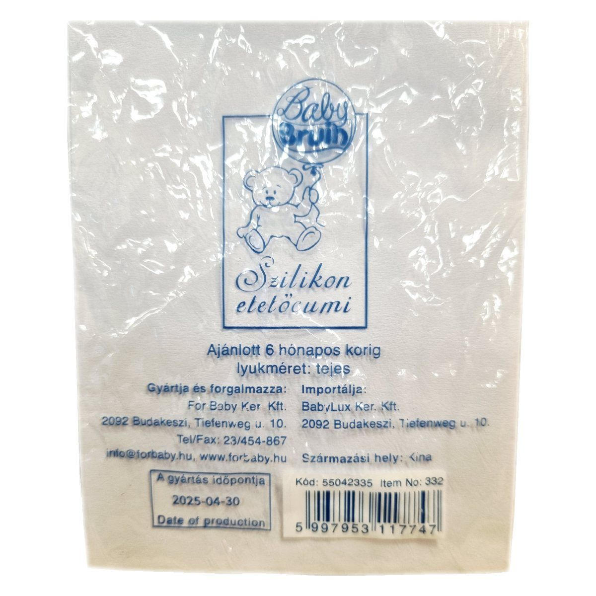 A Baby Bruin Szilikon etetőcumi megbízható, higiénikus megoldás a csecsemők etetéséhez. Puha, tartós szilikon anyagának köszönhetően kíméletes a baba szájához, miközben jól illeszkedik a cumisüveghez. Könnyen tisztítható és sterilizálható, így biztosítható a folyamatos higiénia. A termék forralással fertőtleníthető, napfénytől védve tárolandó, és javasolt rendszeresen cserélni. A gyártó magyarországi forgalmazója a For Baby Kft., importőre a BabyLux Kft.