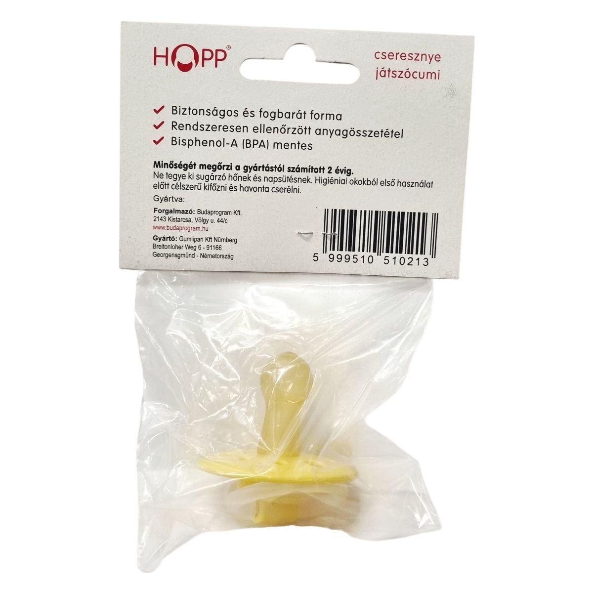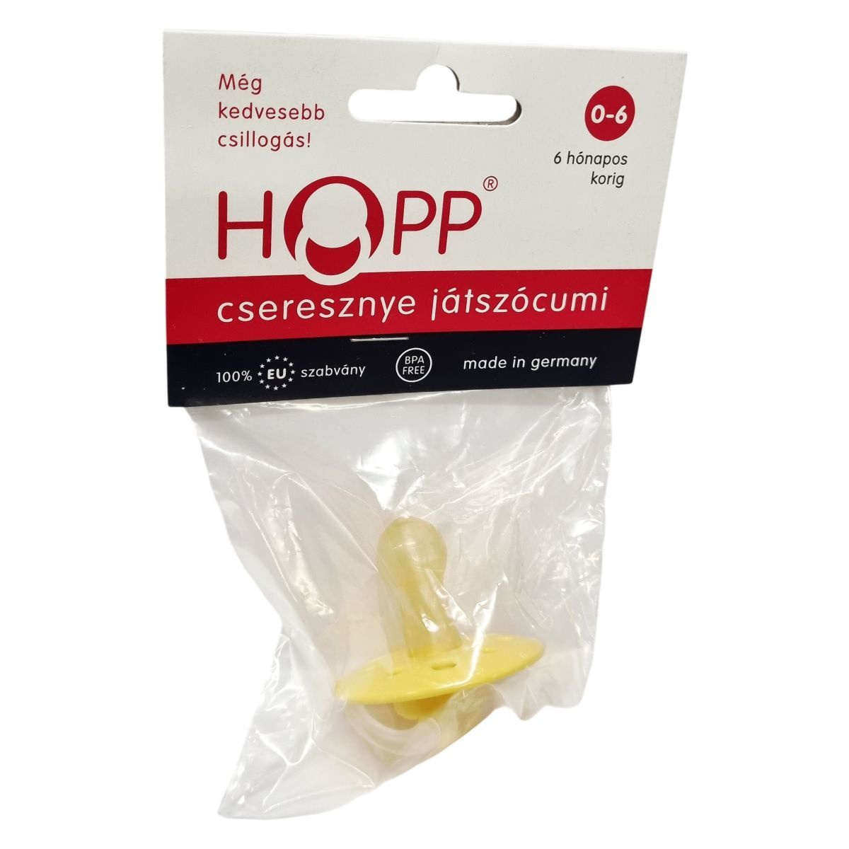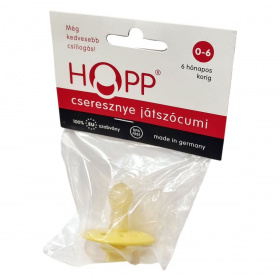 A HOPP® cseresznye játszócumi egy kifejezetten a 0-6 hónapos korosztály számára tervezett babaápolási termék, amely németországi gyártású, magas minőségű alapanyagokból készül. A forma biztonságos a babák számára és támogatja a fogbarát használatot. Anyagösszetételét rendszeresen ellenőrzik, és teljesen mentes a Bisphenol-A (BPA) vegyülettől, így garantált a baba egészségének védelme. A termék minősége két évig megőrizhető a gyártástól számítva, azonban higiéniai szempontból fontos a rendszeres, havonta történő csere. Első használat előtt ajánlott kifőzni, hogy kellően higiénikus legyen. A játszócumi tárolásánál ügyelni kell arra, hogy ne érje sugárzó hő vagy napsütés, mert ez károsíthatja az anyagot.