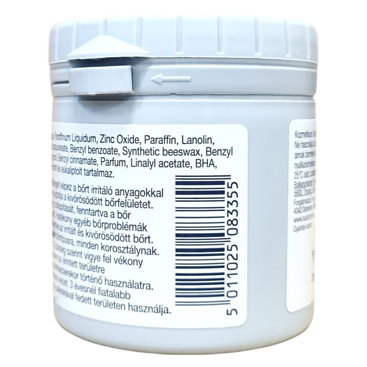 Aqua, Paraffinum Liquidum, Zinc Oxide, Paraffin, Lanolin, Ozokerite, Sorbitan sesquioleate, Benzyl benzoate, Synthetic beeswax, Benzyl alcohol, Propylene glycol, Benzyl cinnamate, Parfum, Linalyl acetate, BHA, Citric acid, BHT