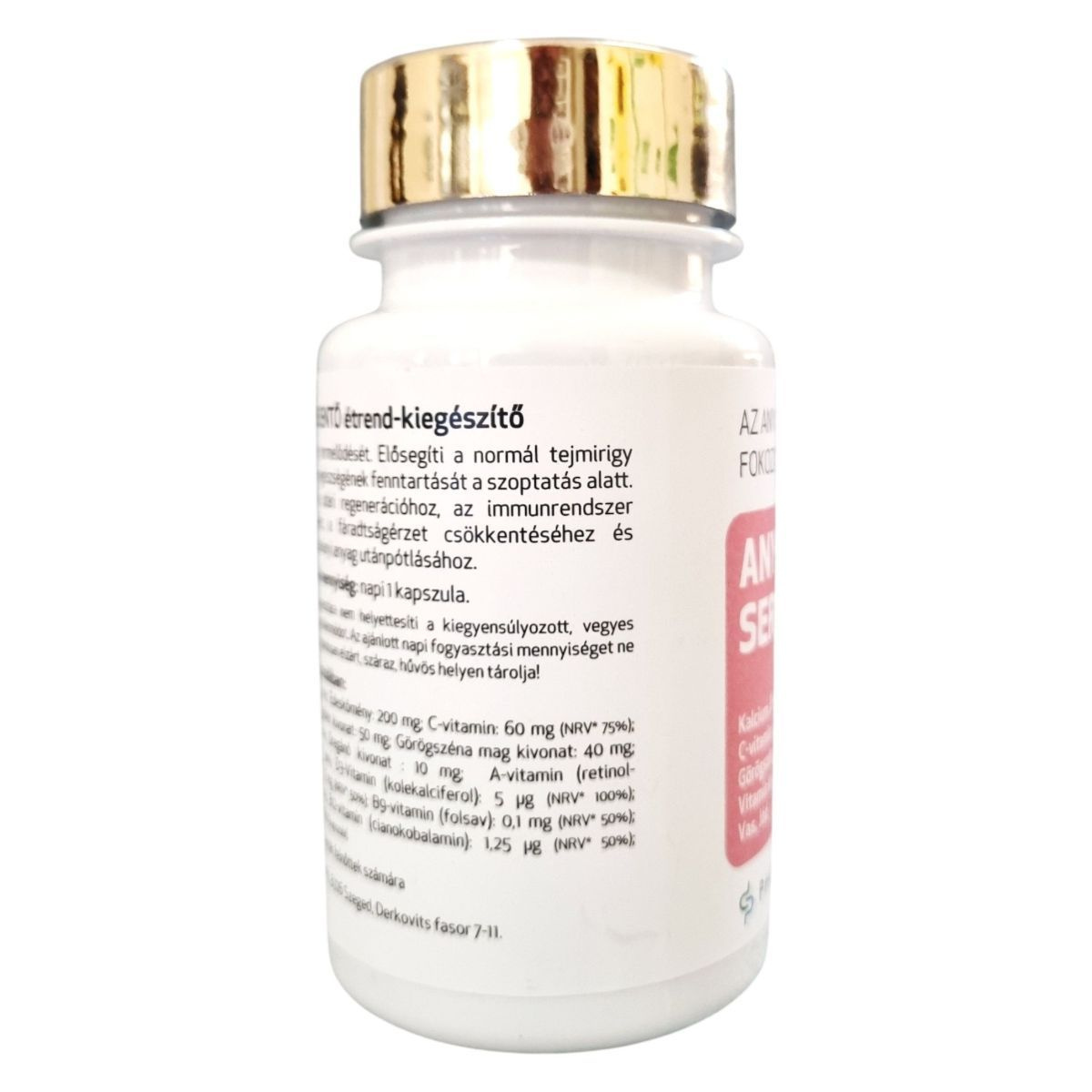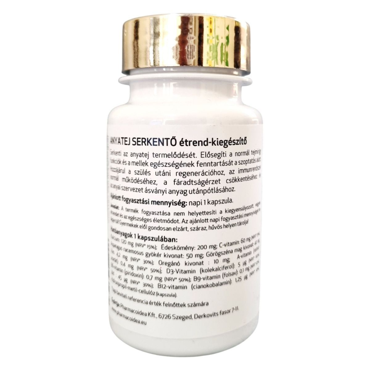 Az ANYATEJ SERKENTŐ étrend-kiegészítő célja, hogy támogassa az anyatej termelését és elősegítse a normál tejmirigy funkciók fenntartását a szoptatás alatt. A termék összetevői, mint a kalcium, édeskömény, C-vitamin, és más vitaminok, hozzájárulhatnak a szülés utáni regenerációhoz, az immunrendszer normál működéséhez, valamint a fáradtságérzet csökkentéséhez. A termék 60 kapszulát tartalmaz, és napi 1 kapszula fogyasztása ajánlott. A termék gyártója a Pharmacoidea Kft., és az OGYÉI notifikációs száma 27644/2021.