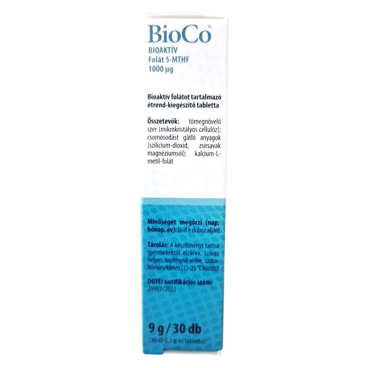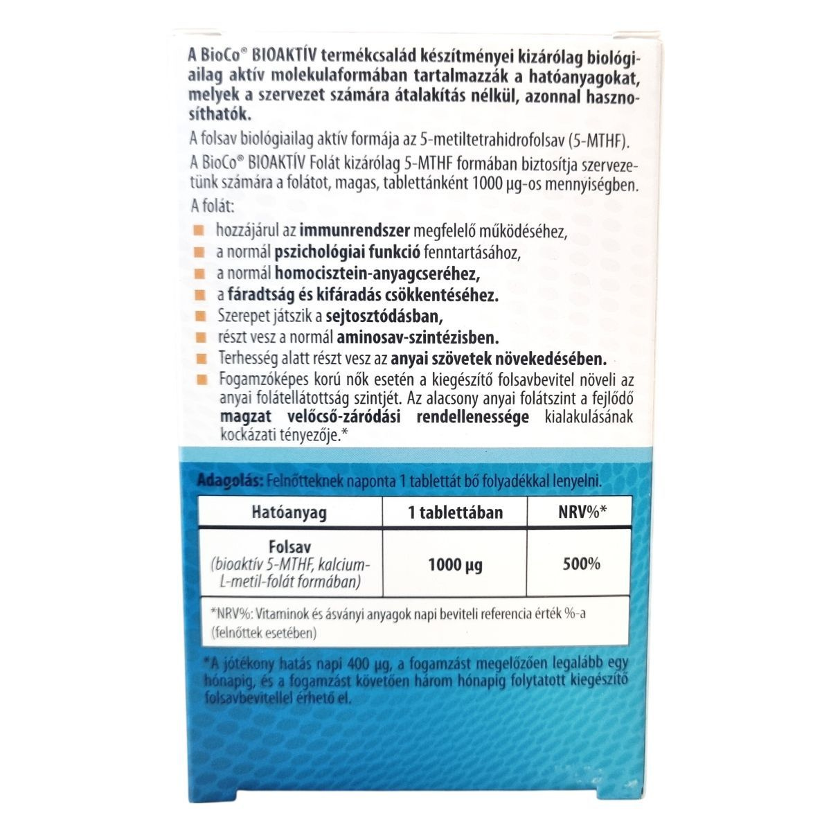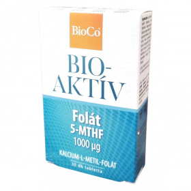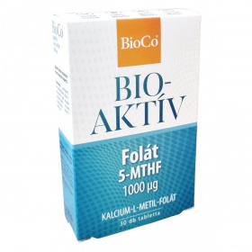 A BioCo® BIOAKTÍV termékcsalád készítményei kizárólag biológiailag aktív molekulaformában tartalmazzák a hatóanyagokat, melyek a szervezet számára átalakítás nélkül, azonnal hasznosíthatók. A folsav biológiailag aktív formája az 5-metiltetrahidrofolsav (5-MTHF). A BioCo® BIOAKTÍV Folát kizárólag 5-MTHF formában biztosítja szervezetünk számára a folátot, magas, tablettánként 1000 µg-os mennyiségben. A folát hozzájárulhat az immunrendszer megfelelő működéséhez, a normál pszichológiai funkció fenntartásához, a normál homocisztein-anyagcseréhez, a fáradtság és kifáradás csökkentéséhez. Szerepet játszhat a sejtosztódásban, részt vehet a normál aminosav-szintézisben. Terhesség alatt részt vehet az anyai szövetek növekedésében, és fogamzóképes korú nők esetén a kiegészítő folsavbevitel növelheti az anyai folátellátottság szintjét. Az alacsony anyai folátszint a fejlődő magzat velőcső-záródási rendellenessége kialakulásának kockázati tényezője. A termék magyar fejlesztésű és gyártású, bár a hatóanyag nem Magyarországról származik. A gyártás az ISO 22000 és GMP szabványok szerint tanúsított élelmiszerbiztonsági rendszerben történik.