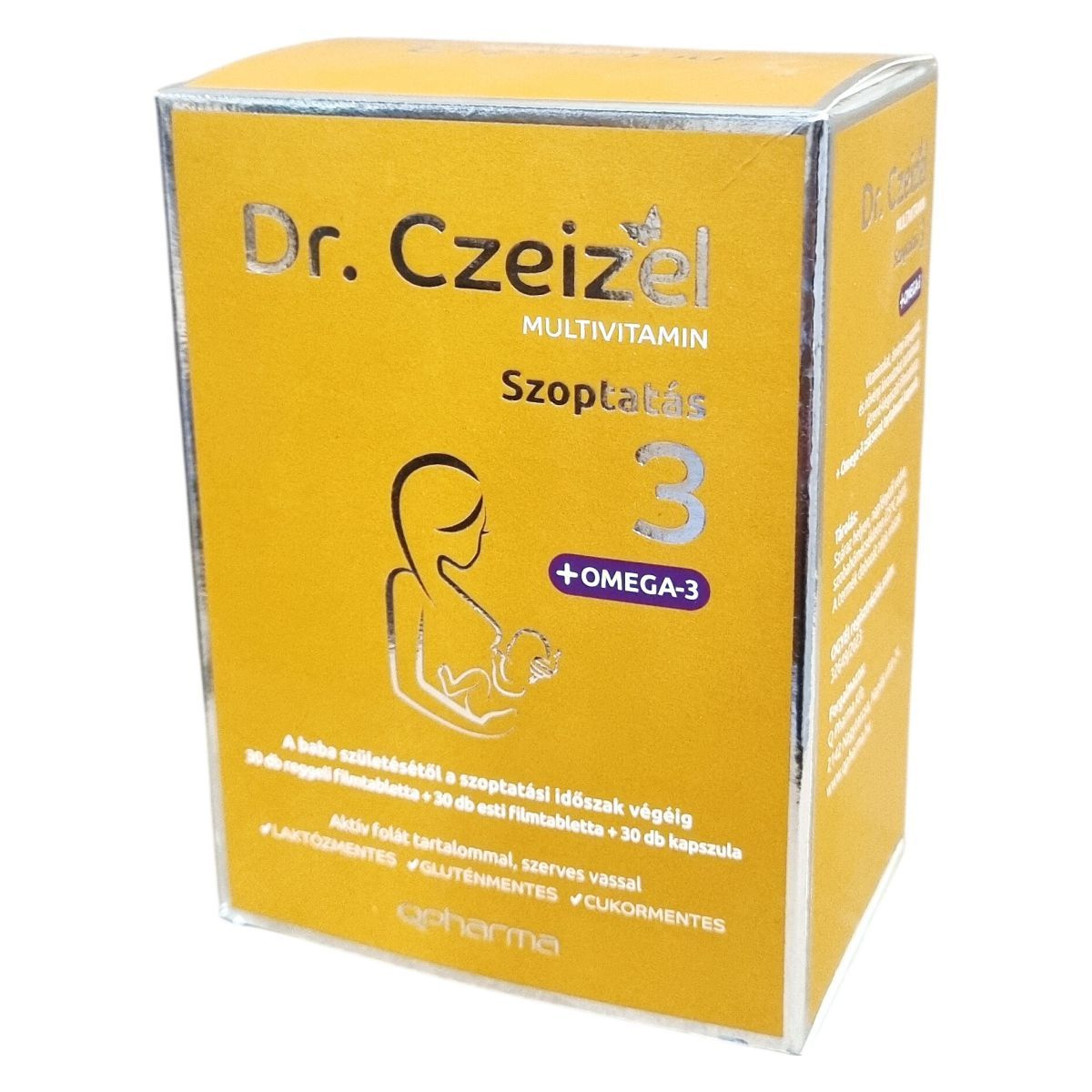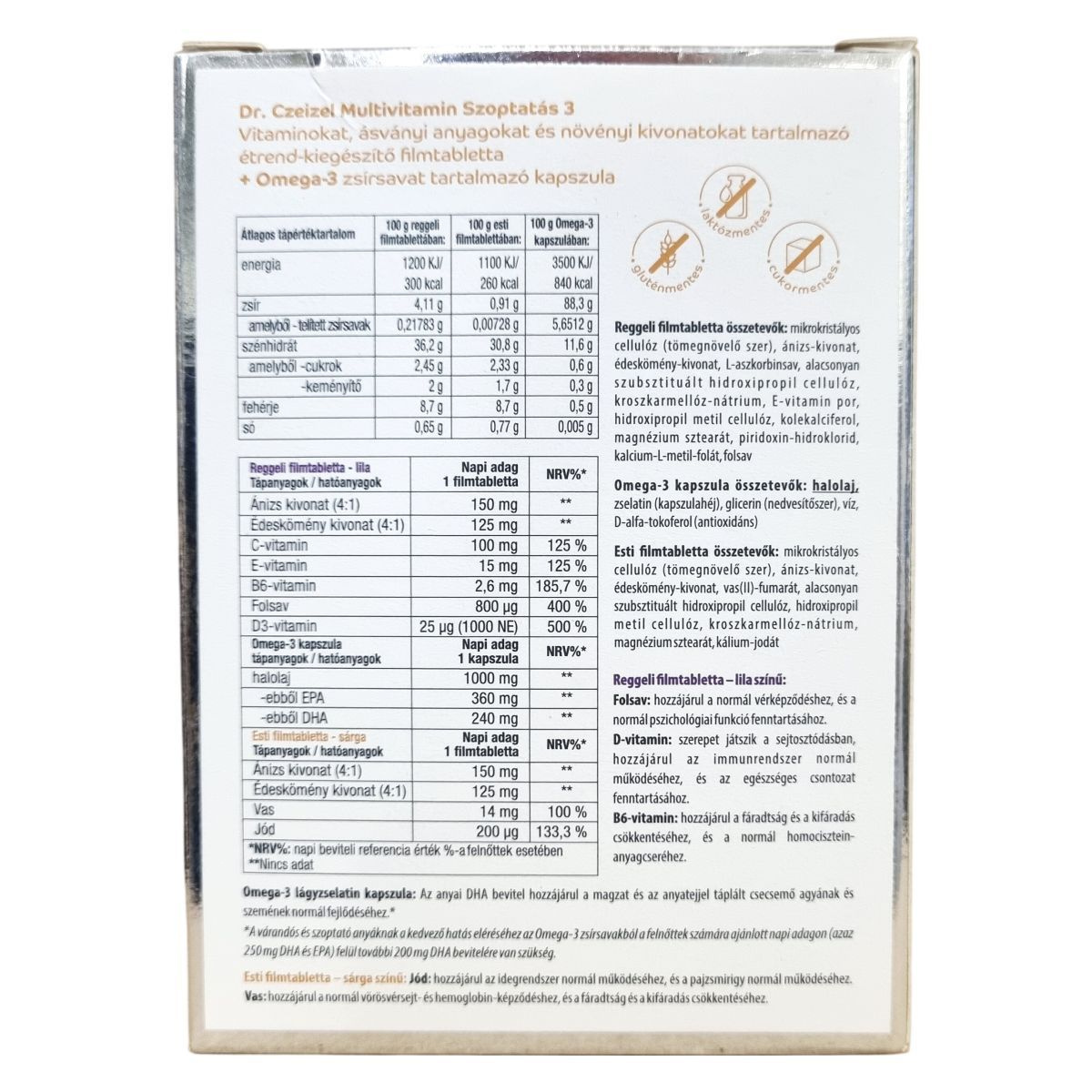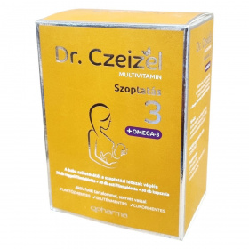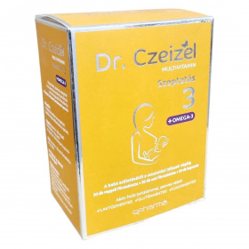 A Dr. Czeizel MULTIVITAMIN Szoptatás 3 +OMEGA-3 egy komplex étrend-kiegészítő, amely vitaminokat, ásványi anyagokat és növényi kivonatokat tartalmaz filmtabletta formában, továbbá Omega-3 zsírsavat kapszulában. A termék aktív folát tartalommal és szerves vasforrással rendelkezik, valamint mellőzi a laktózt, glutént és a cukrot. A reggeli filmtablettába folsav, D-vitamin és B6-vitamin tartozik, melyek hozzájárulhatnak a normál vérképződéshez, a sejtosztódáshoz, az immunrendszer működéséhez, valamint a fáradtság csökkentéséhez. Az esti filmtabletta jódot és vasat tartalmaz, amelyek támogathatják az idegrendszer és a pajzsmirigy egészséges működését. Az Omega-3 kapszula halolajat tartalmaz, amely az anyai DHA bevitelével hozzájárulhat a magzat és a szoptatott csecsemő agyának és szemének fejlődéséhez. A termék használata szoptatás alatt ajánlott, a szülést követően a teljes anyatejes táplálási időszakra. A termék nem helyettesíti a változatos étrendet és egészséges életmódot, valamint terhesség alatt nem szedhető. Kongruens csomagolása 30-30 reggeli és esti filmtablettát, valamint 30 db Omega-3 kapszulát tartalmaz.