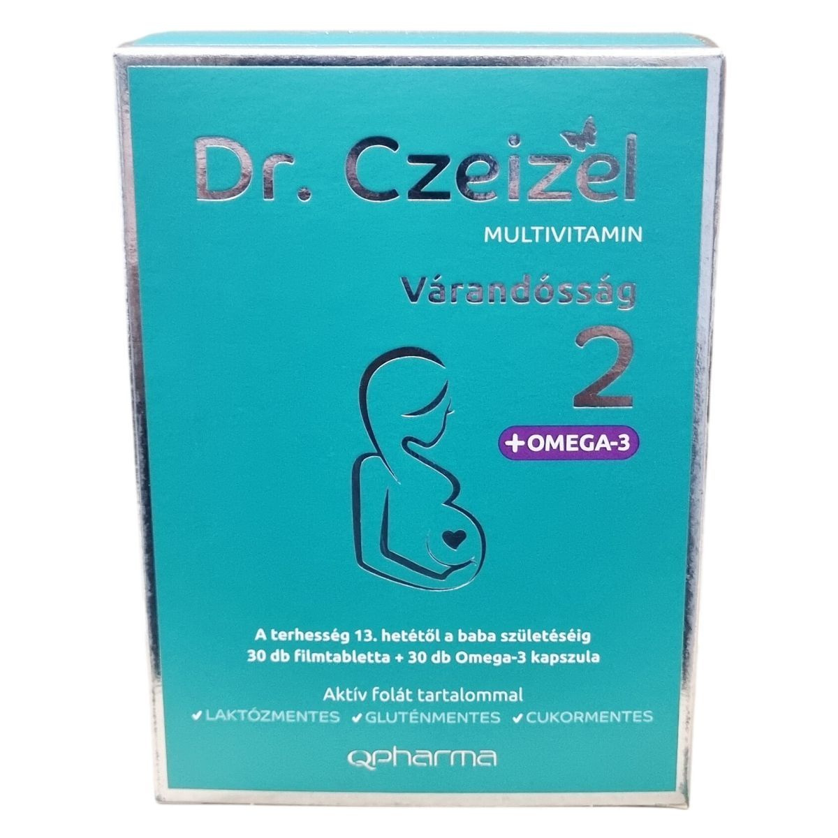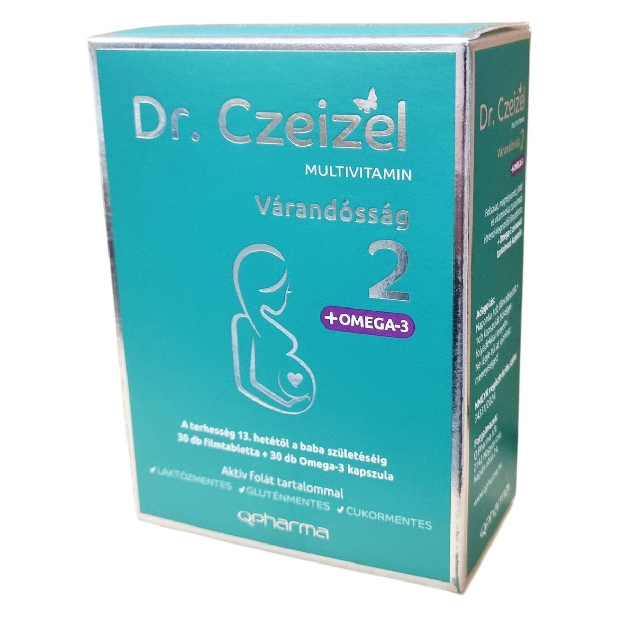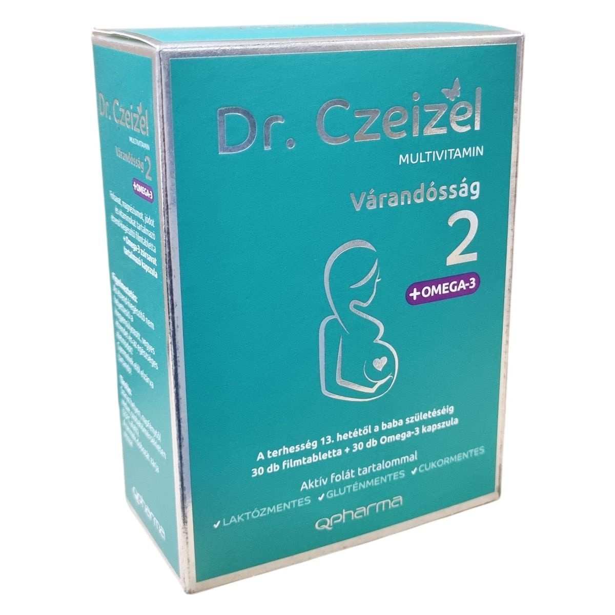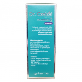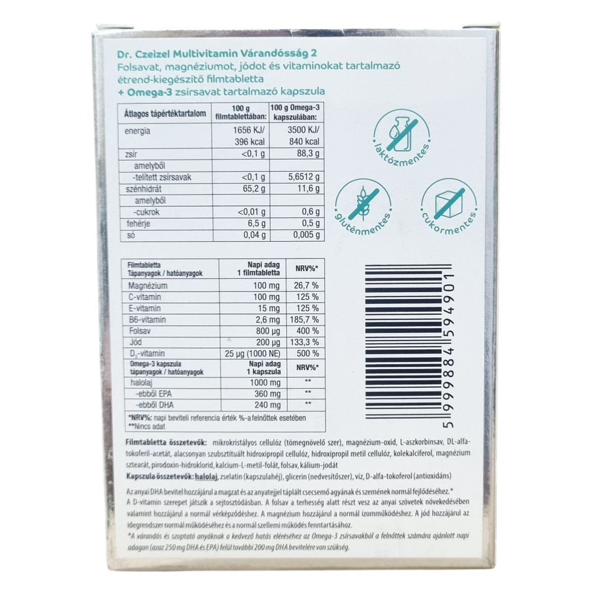 A Dr. Czeizel Multivitamin Várandósság 2 +Omega-3 filmtabletta és kapszula kombinációja folsavat, magnéziumot, jódot és több fontos vitamint tartalmaz, amelyek a várandósság második trimeszterétől a születésig való alkalmazás során hozzájárulhatnak az anyai és magzati egészség támogatásához. A benne lévő DHA hozzájárulhat a magzat és az anyatejjel táplált csecsemő agyának és szemének normál fejlődéséhez, míg a D-vitamin szerepet játszhat a sejtosztódásban. A folsav a terhesség ideje alatt részt vehet az anyai szövetek növekedésében és a normál vérképződésben. A magnézium hozzájárulhat a normál izomműködéshez, a jód pedig az idegrendszer normál működéséhez és a normál szellemi működés fenntartásához. Az ajánlott adag felül további DHA-bevitelt javasolhat a kedvező hatás eléréséhez. A filmtabletta laktóz-, glutén- és cukormentes, így támogatja az érzékenyek számára is használhatóságot. A termék nem helyettesíti a kiegyensúlyozott étrendet és az egészséges életmódot.