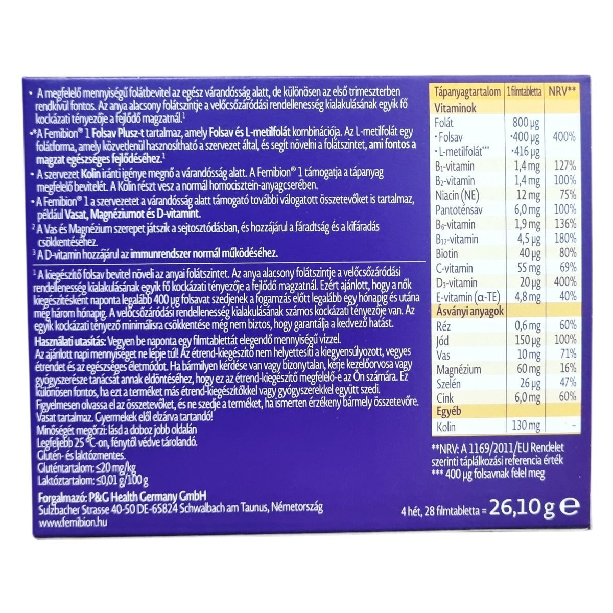 A Femibion® Korai várandósság 1 egy olyan étrend-kiegészítő filmtabletta, amely elsősorban az első trimeszter végéig támogatja az anyát és a magzat egészséges fejlődését. A termék alapja a Folsav Plusz, amely a folsav és L-metilfolát kombinációja, és segítheti a folátszint növelését a szervezetben, amely fontos a velőcsőzáródási rendellenességek kockázatának csökkentésében. Továbbá tartalmaz kolin-bitartrátot, amely hozzájárulhat a normál homocisztein-anyagcseréhez, valamint fontos ásványi anyagokat, mint a vas, magnézium, cink, réz, jód és szelén. Ezek az ásványi anyagok szerepet játszanak a sejtosztódásban, az immunrendszer és az anyai szervezet támogatásában, továbbá segíthetik a fáradtság és kifáradás csökkentését. A termék szigorúan glutén- és laktózmentes, és gyermekek elől elzárva tartandó. Az étrend-kiegészítő nem helyettesíti a kiegyensúlyozott, vegyes étrendet és az egészséges életmódot, ezért használata előtt ajánlott orvosi vagy gyógyszerészi tanácsot kérni, különösen más készítmények szedése esetén.