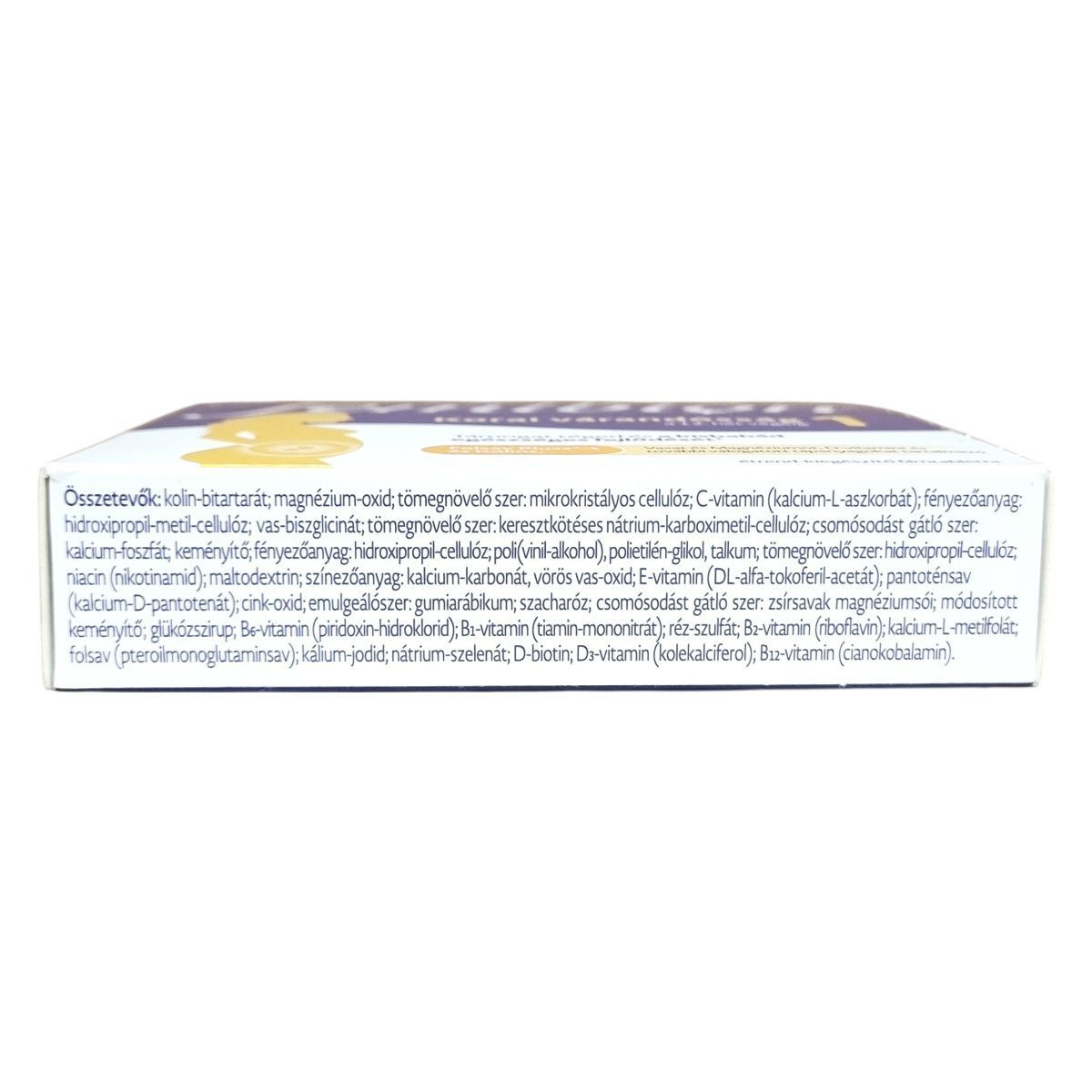 kolin-bitartrát, magnézium-oxid, mikrokristályos cellulóz, kalcium-L-aszkorbát, hidroxipropil-metil-cellulóz, vas-biszglicinát, keresztkötéses nátrium-karboximetil-cellulóz, kalcium-foszfát, keményítő, hidroxipropil-cellulóz, poli(vinil-alkohol), polietilén-glikol, talkum, niacin (nikotinamid), maltodextrin, kalcium-karbonát, vörös vas-oxid, DL-alfa-tokoferil-acetát, kalcium-D-pantotenát, cink-oxid, gumiarábikum, szacharóz, zsírsavak magnéziumsói, módosított keményítő, glükózszirup, piridoxin-hidroklorid, tiamin-mononitrát, réz-szulfát, riboflavin, kalcium-L-metilfolát, folsav (pteroilmonoglutaminsav), kálium-jodid, nátrium-szelenát, D-biotin, kolekalciferol, cianokobalamin