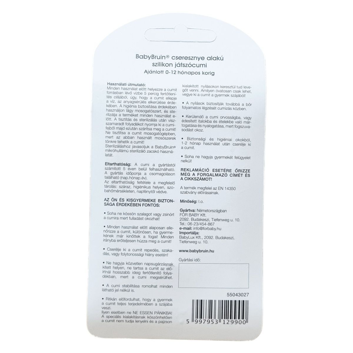 A BabyBruin® cseresznye alakú szilikon játszócumi 0–12 hónapos korú gyermekek számára ajánlott. A cumi a gyártástól számított 5 éven belül felhasználható. A gyártás időpontja a csomagoláson kerül feltüntetésre. A speciális kialakítás megakadályozza a lenyelést, a pajzson kialakított nyílások pedig lehetővé teszik a levegővételt és a bőr folyamatos légzését cumizás közben. Minősége I. osztály. Gyártva Németországban. Importőr: BabyLux Kft.