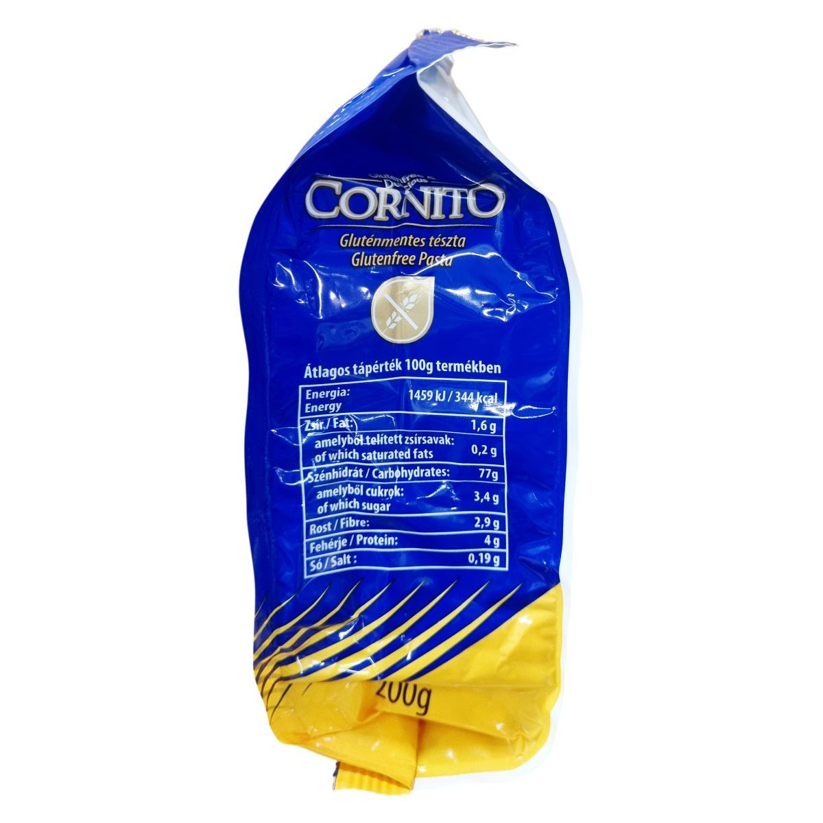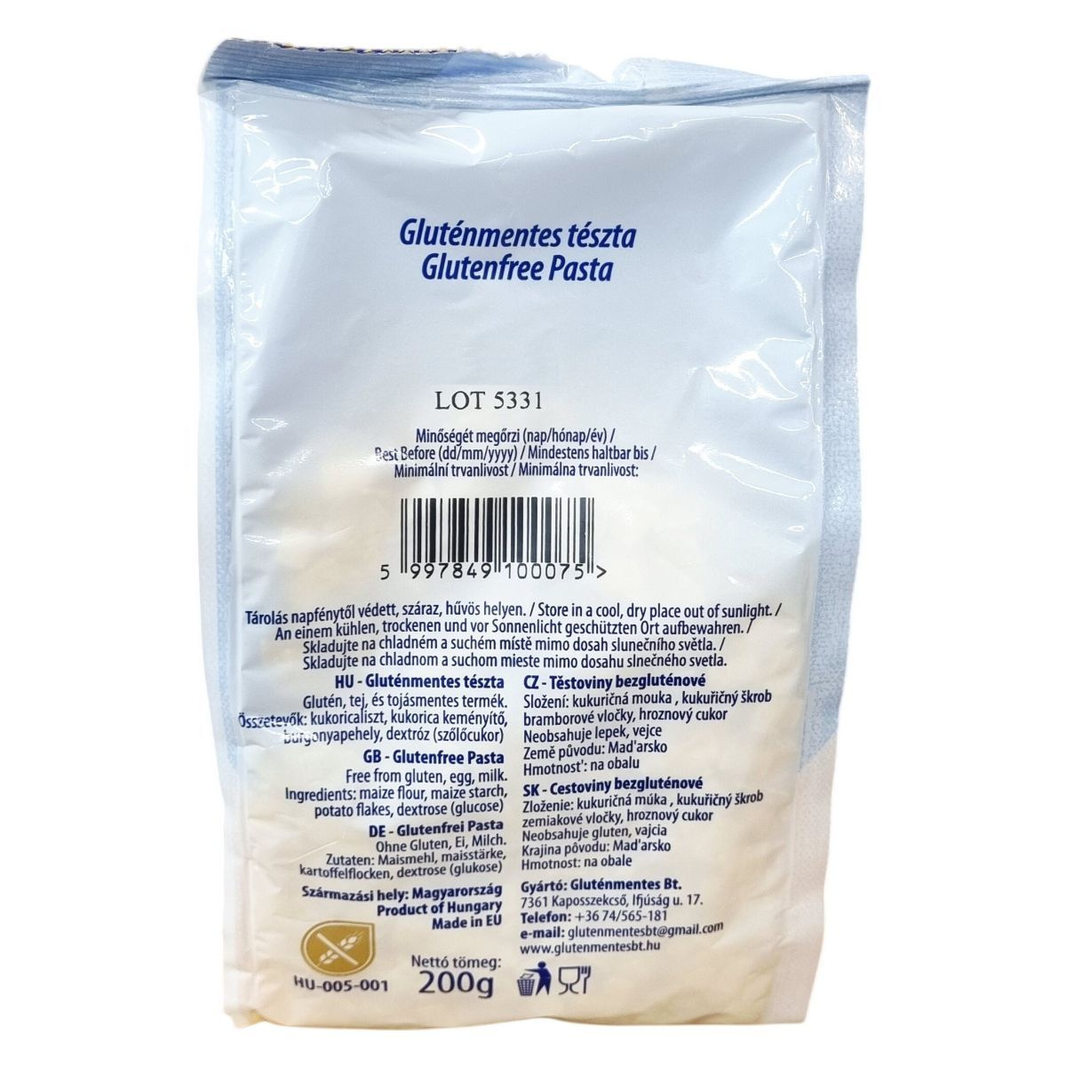 A termék Magyarországon készült, és az EU-ban gyártott gluténmentes tészta, megkülönböztetve a tej- és tojásmentességgel. A csomagoláson feltüntetett nettó tömeg 200 gramm. A termék külhoni nevei megerősítik gluténmentes jellegét minden vonatkozó nyelven, emellett a csomagoláson található eredetmeghatározás is Magyarországra utal.