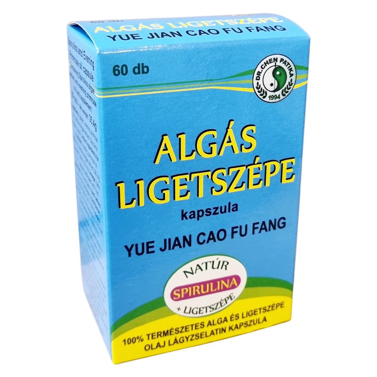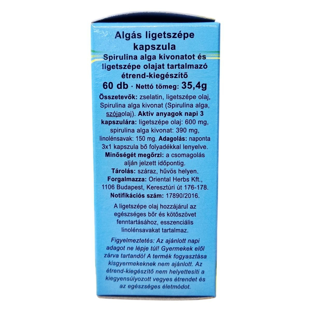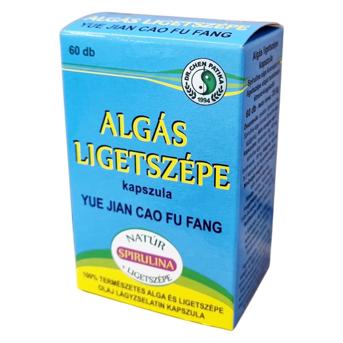 A Dr. Chen Patika algás ligetszépe kapszula 100%-ban természetes spirulina alga és ligetszépe olaj lágyzselatin kapszula formában. Kizárólag természetes összetevőket tartalmaz, így hozzájárulhat a bőr és kötőszövet egészségének fenntartásához. A spirulina alga kivonat mellett a ligetszépe olaj esszenciális linolénsavakat tartalmaz, melyek kedvezően hathatnak a szervezet működésére. A termék nettó tömege 35,4 g, és ajánlott napi adagja három kapszula, amely könnyen beilleszthető a mindennapi étrendbe. Tárolása száraz, hűvös helyen javasolt. A kapszulák gyártója és forgalmazója az Oriental Herbs Kft., amely 1994 óta kínál minőségi termékeket. A fogyasztás előtt mindig vegye figyelembe az ajánlott mennyiséget, valamint tartsa távol gyermekektől. Ez az étrend-kiegészítő nem helyettesíti a kiegyensúlyozott étrendet és az egészséges életmódot.
