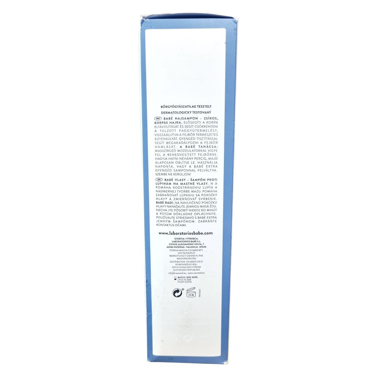 A BABÉ Anticaspa Oleosa sampon dermatológiailag tesztelt termék, amely kifejezetten zsíros, korpás hajra lett kifejlesztve. Segít eltávolítani a korpát és csökkenteni a túlzott faggyútermelést, ezáltal visszaállítva a fejbőr természetes egyensúlyát. Gyengéd tisztítással segít megelőzni a fejbőr hámlását. A terméket masszírozó mozdulatokkal kell felvinni a benedvesített fejbőrre, néhány percig hagyni hatni, majd alaposan leöblíteni. A termék használható naponta, vagy a BABÉ extra gyengéd samponnal felváltva. Fontos, hogy szembe ne kerüljön. A terméket a LABORATORIOS BABÉ S.L. gyártja, és a CEUMED KFT. forgalmazza Magyarországon.