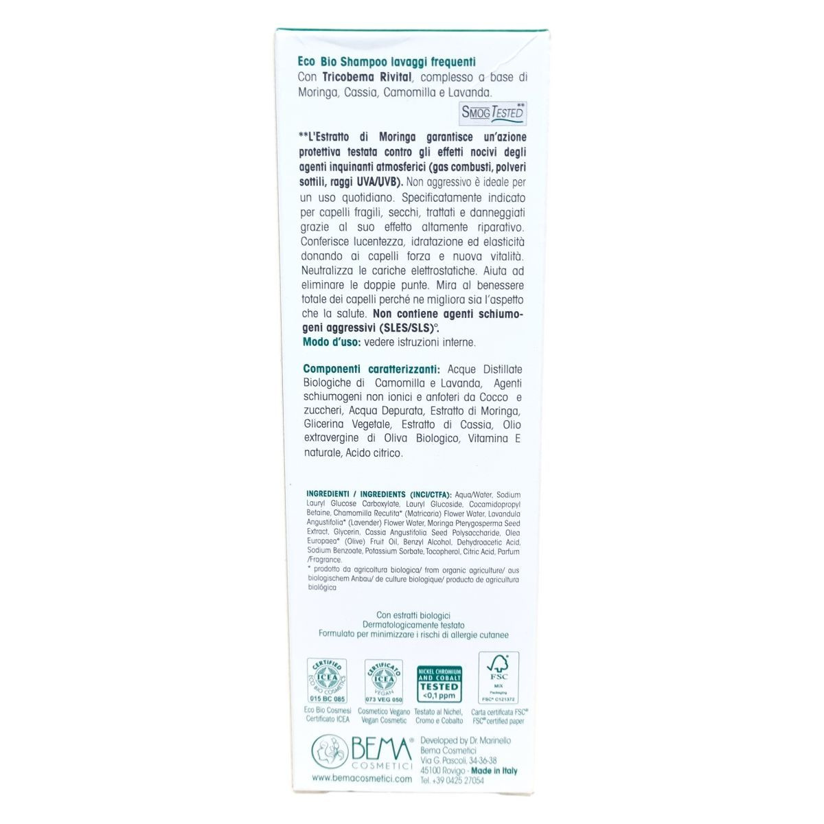 Certificato ICEA, Eco Biologico, Dermatologicamente Testato, Cosmetico Vegano, FSC certified paper