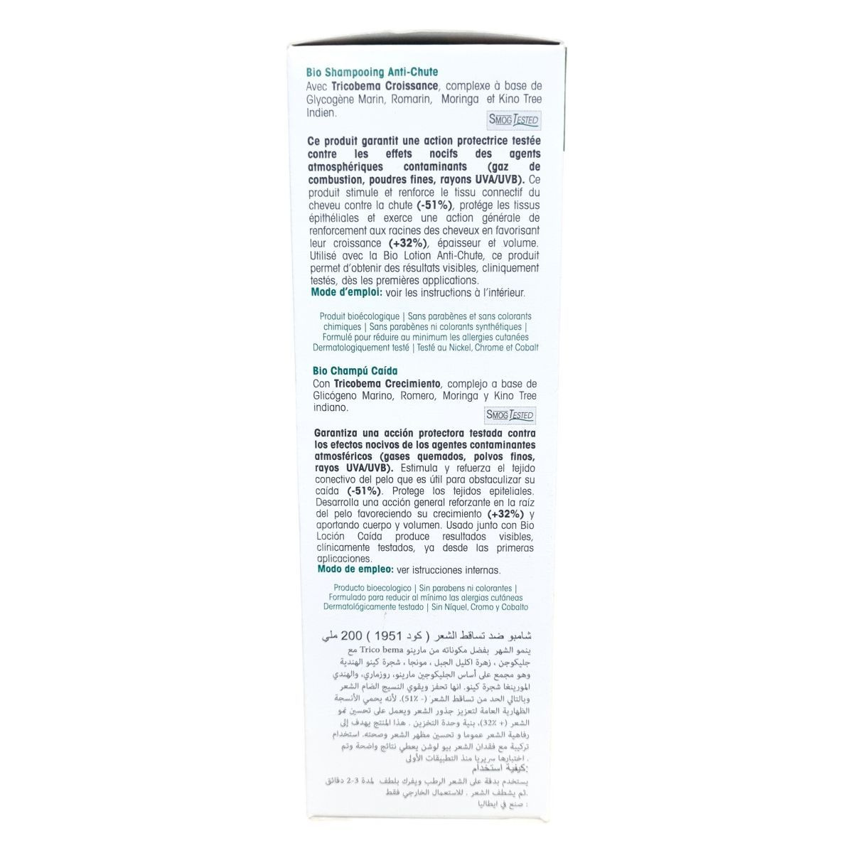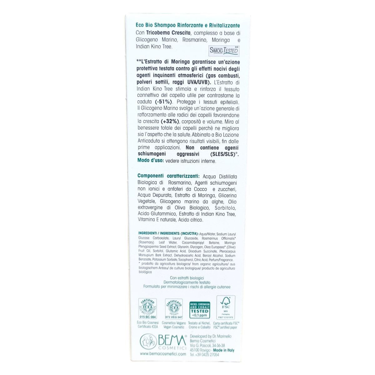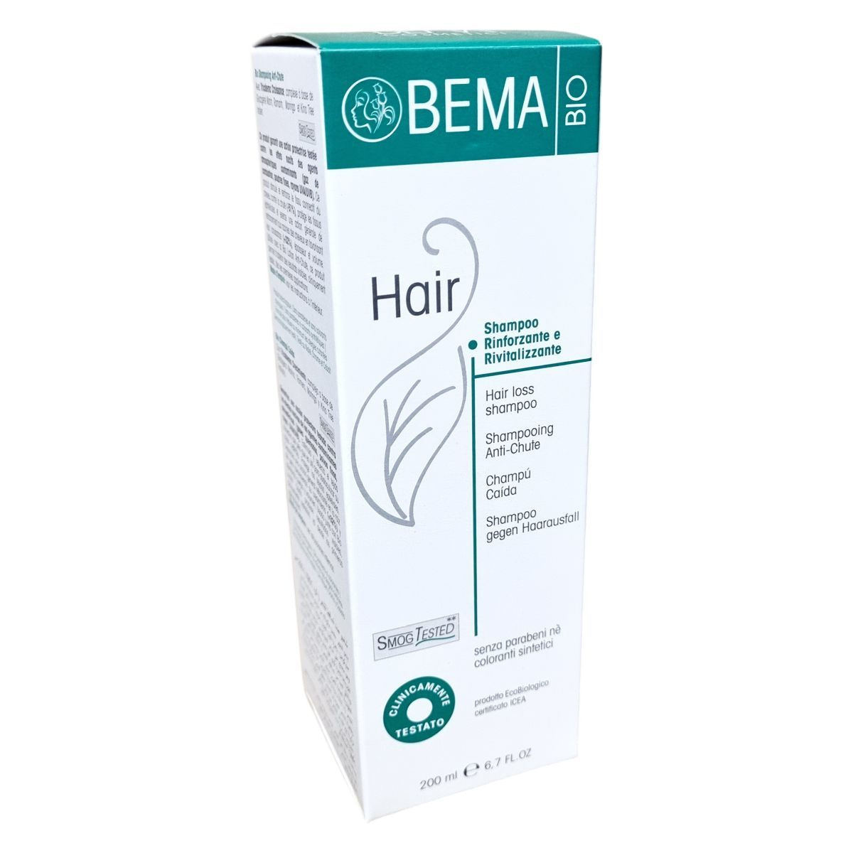 A BEMA BIO Hajsampon hajhullásra klinikailag tesztelt készítmény, mely a Tricobema Crescita hatóanyagkomplexet tartalmazza tengeri glikogénnel, rozmaringgal, moringával és indiai kinofával. Védi a hajat a légszennyezés, égéstermékek, finom részecskék és UVA/UVB sugarak káros hatásaitól. A hatóanyagok erősítik a haj kötőszövetét, csökkentve a hajhullást akár 51%-kal, miközben védi a hámsejteket és támogatja a hajgyökér egészségét, ezáltal serkentve a haj növekedését 32%-kal. A használatával a haj szerkezete és volumene is javul. A termék paraben- és mesterséges színezékmentes, nem tartalmaz agresszív habzóanyagokat, és dermatológiailag tesztelt, valamint tesztelték nikkelez, króm és kobalt tartalomra is. A csomagolás FSC papírból készült. Használata együtt a Bio Lozione Anticaduta (Bio Lotion Hair Loss) készítménnyel még jobb, klinikailag bizonyított eredményeket nyújt a hajhullás elleni küzdelemben.